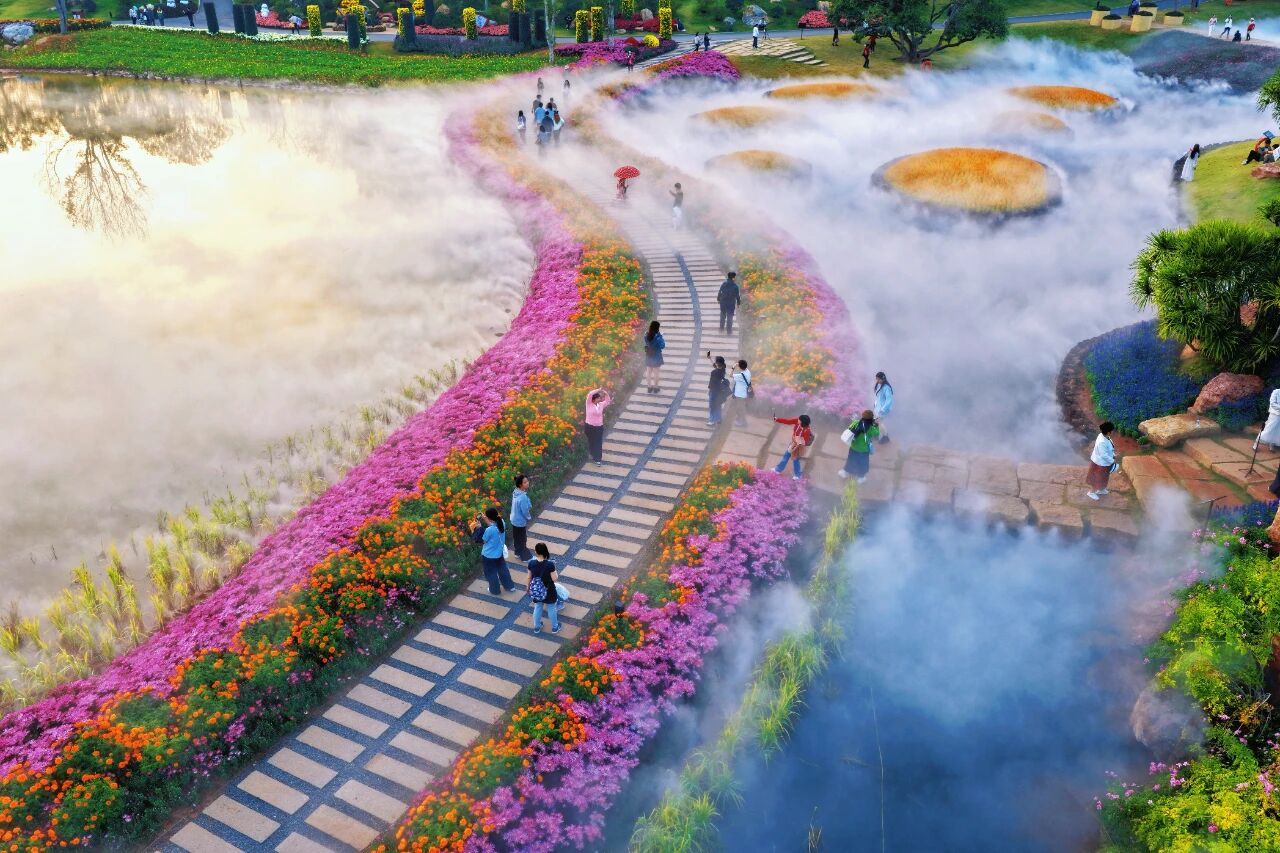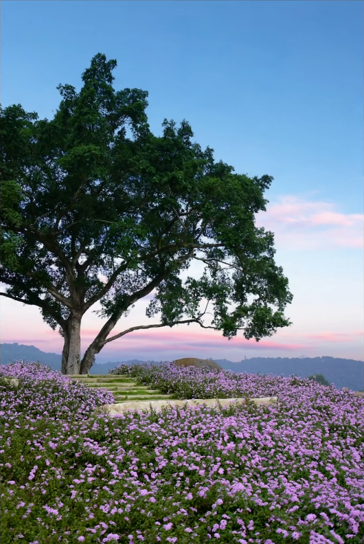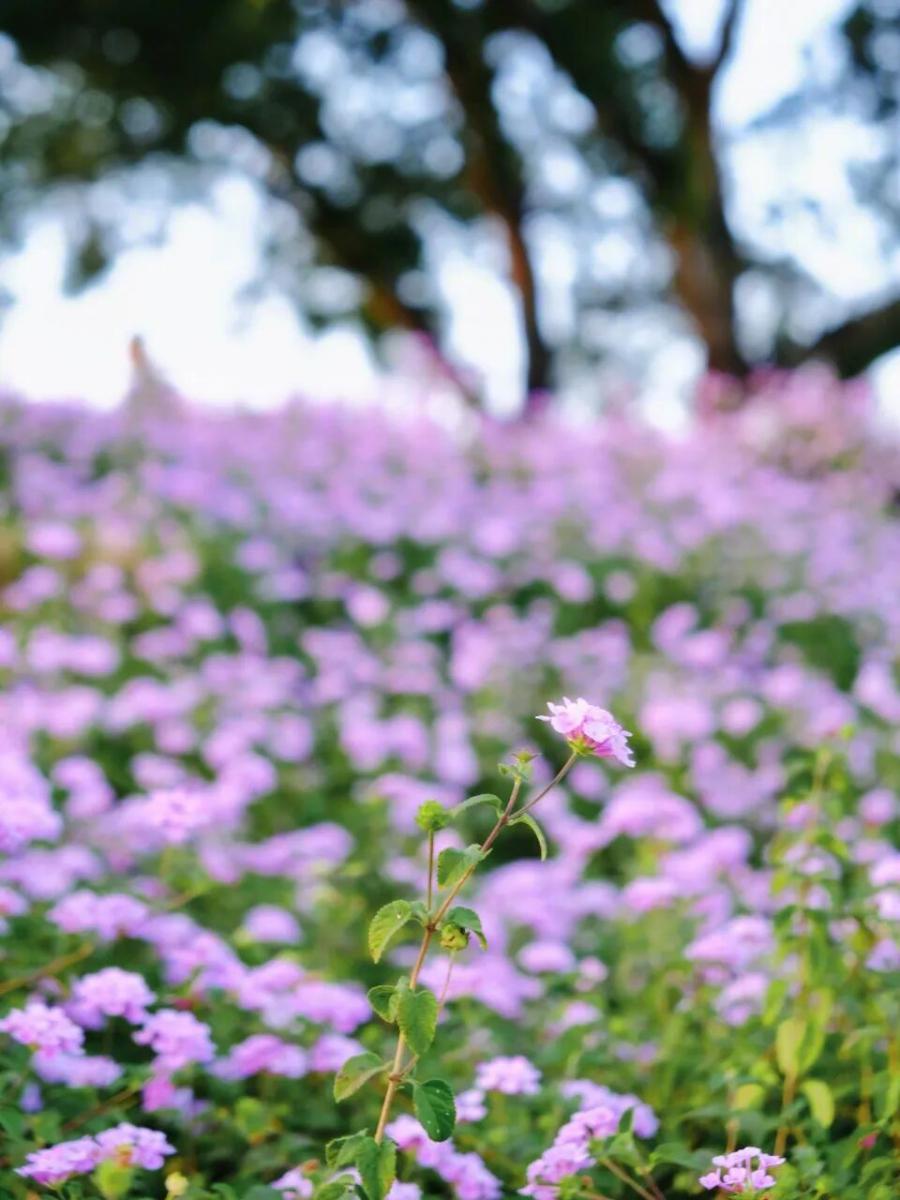 集齐一路色彩,开阔的音乐大草坪是出片的终极打卡地。马缨丹编织的碎花地毯在草坪上绵延开来,宛如繁星落地。