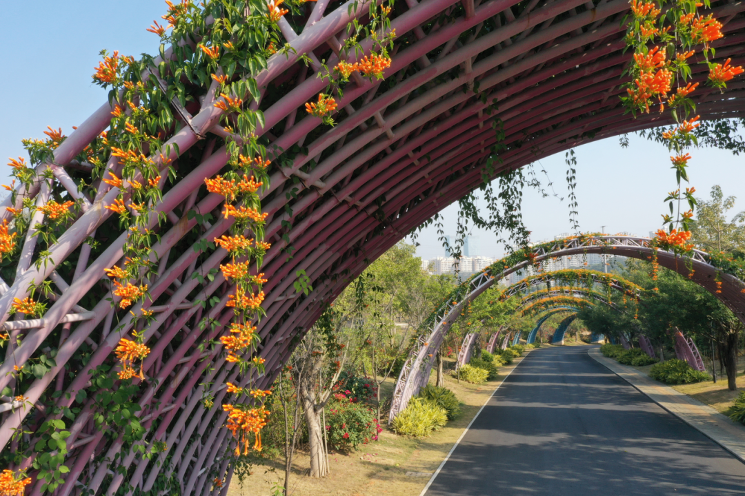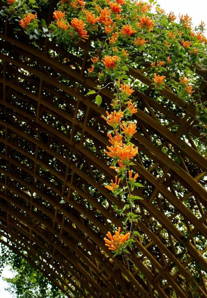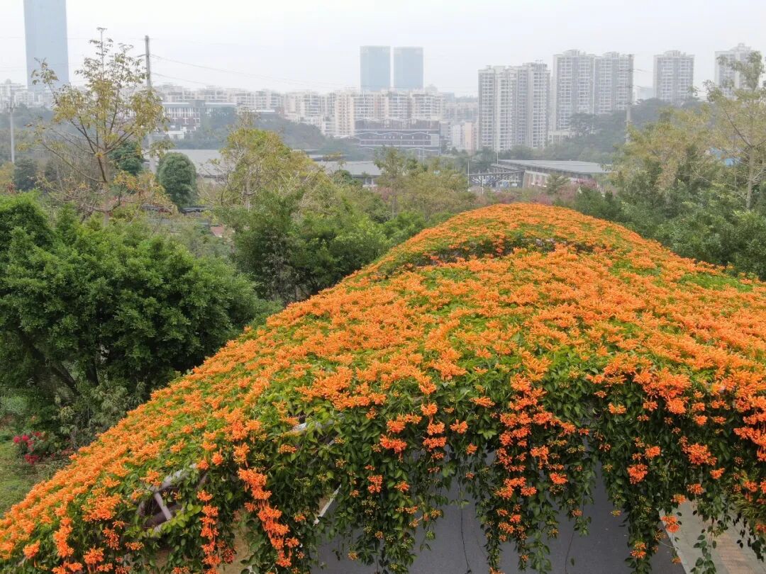 循着暖意前行,五色廊与樱花园藏着冬日最动人的暖调。一串串橙红的炮仗花,像点燃的冬日火炬,在阳光照射下愈发耀眼夺目。
