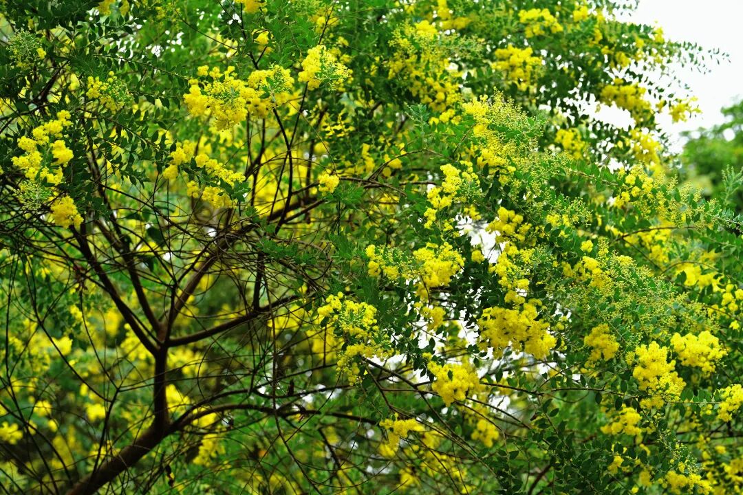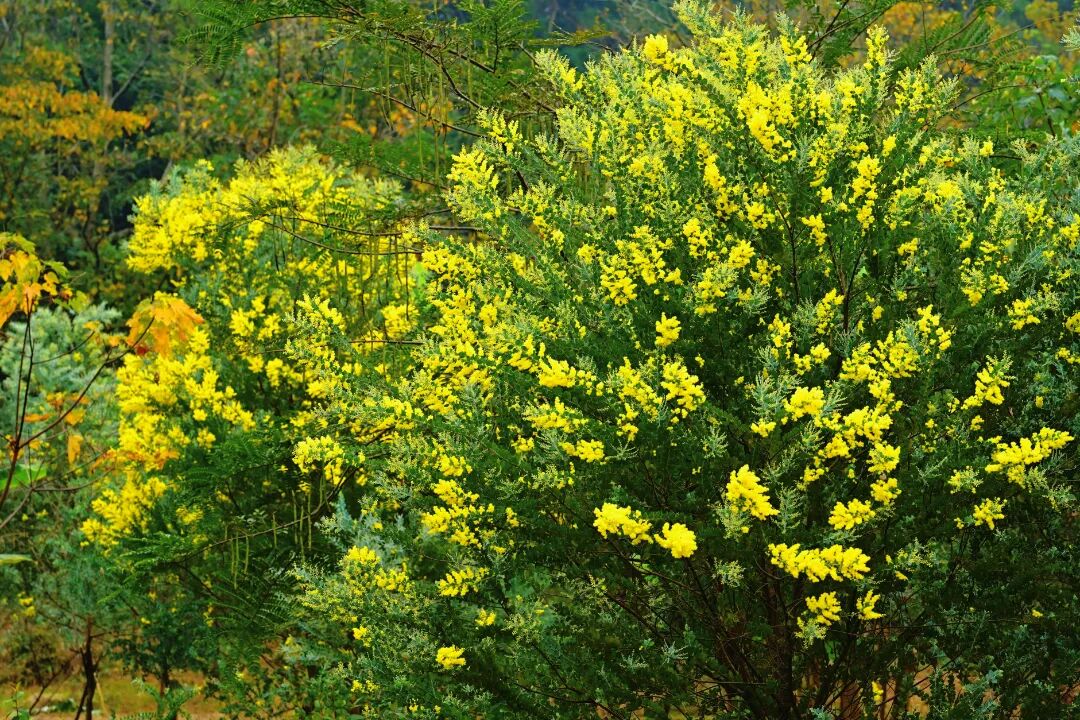 丛林栈道的静谧角落,银叶金合欢正悄然绽放。细长的花枝上,一团团金黄的花球如云似雾,配上银灰色的叶片,在阳光下透着高级质感。这里的氛围静谧雅致,花瓣上形成细腻光影,最适合拍摄清新文艺风照片。随手一拍都是自带电影感的治愈画面。