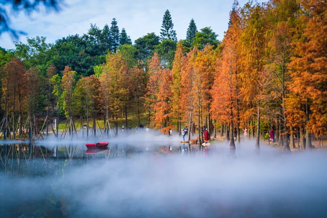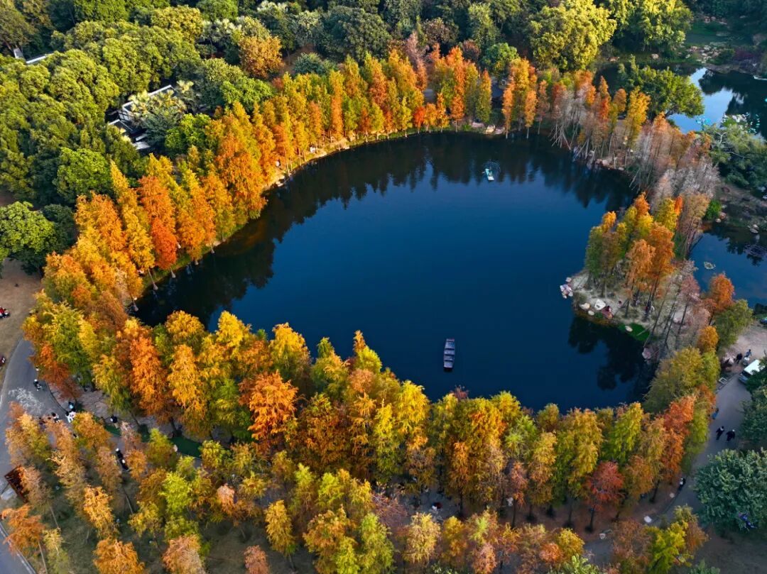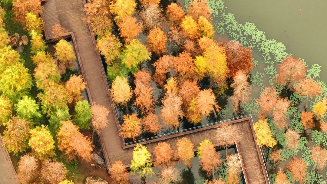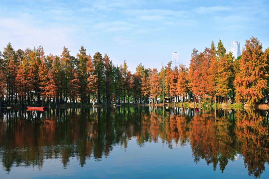 若偏爱沉静景致,金杉湖便是不容错过的光影秘境。水边的落羽杉林已换上暖褐色调,从锈红到金棕的自然渐变,在晴空与湖水的映衬下愈发高级。