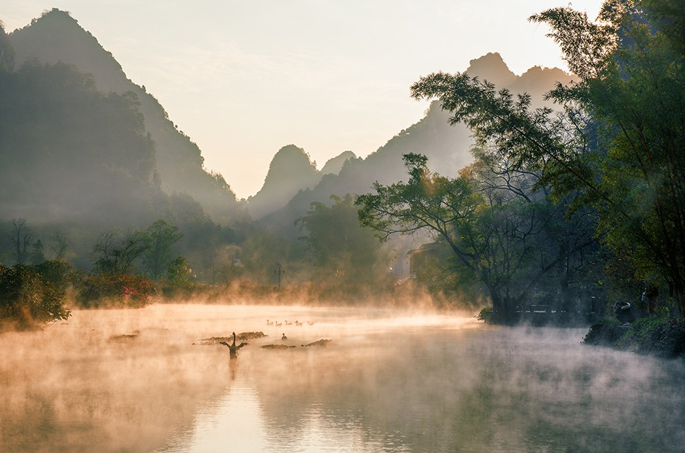 鹅泉日出晨雾缭绕 别具田园诗意