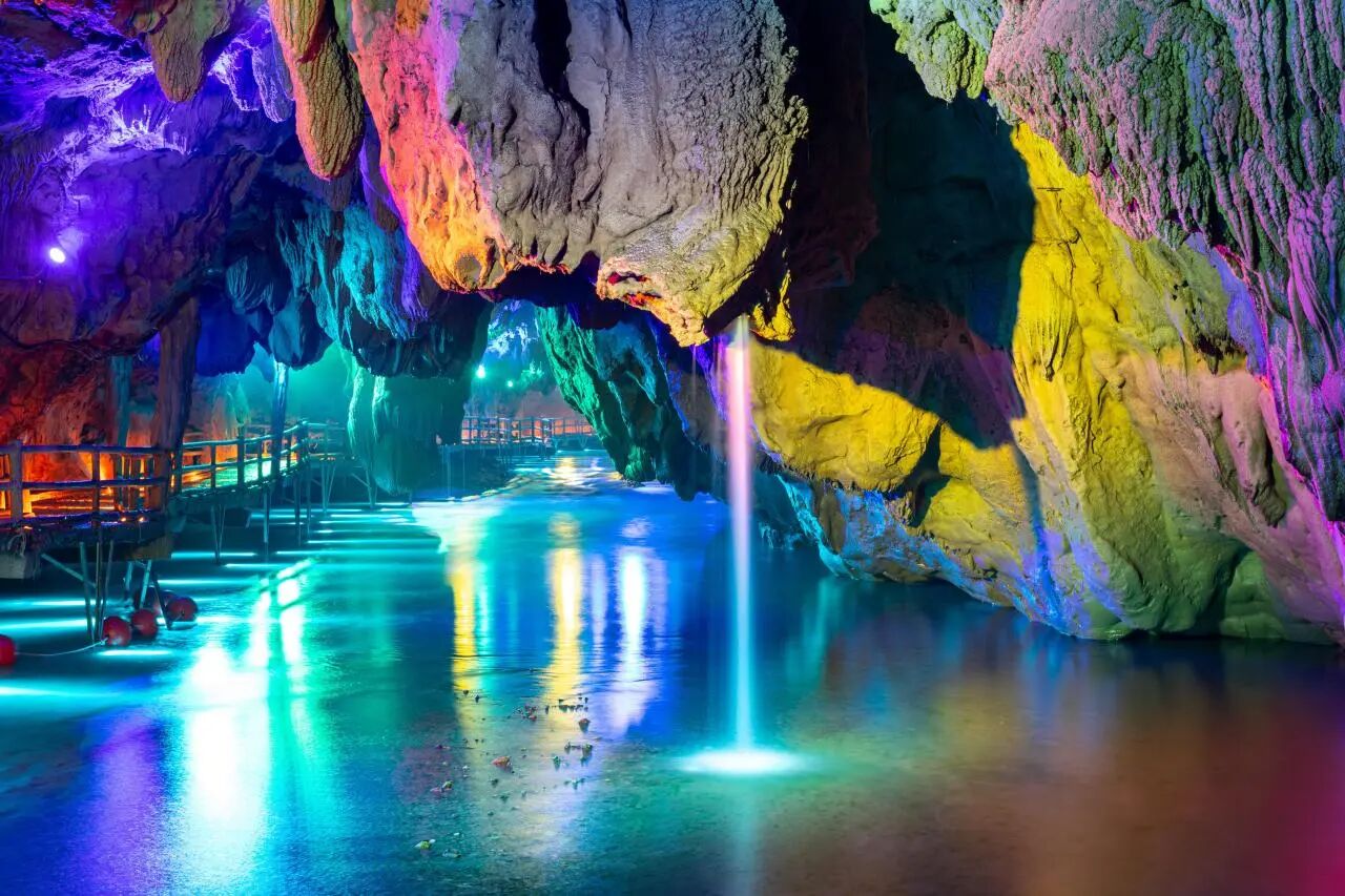 天然喀斯特溶洞搭配灯光