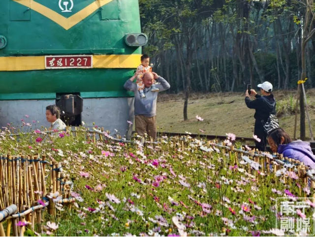 在绿城南宁,即使是冬季,也是繁花盛景。近日,有市民到南宁市江南公园散步锻炼时发现,在位于江南公园的东门出口,一列火车头静静伫立,铁轨上斑驳的痕迹诉说着岁月的沧桑,而与火车头同框的是一片盛装登场的格桑花,这里成为了众多市民游客争相拍照打卡的热门景点。