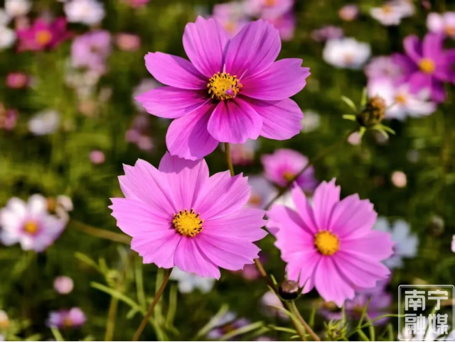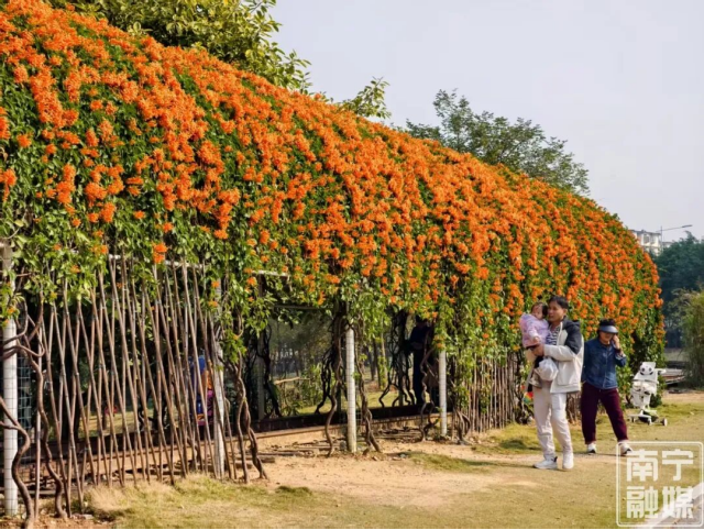 据悉,江南公园目前种植的格桑花面积约1200平方米,目前连片的格桑花竞相绽放,成为南宁市又一道亮丽的景观。另外,公园内还有一面正在热烈绽放着的炮仗花墙,别有一番景致。