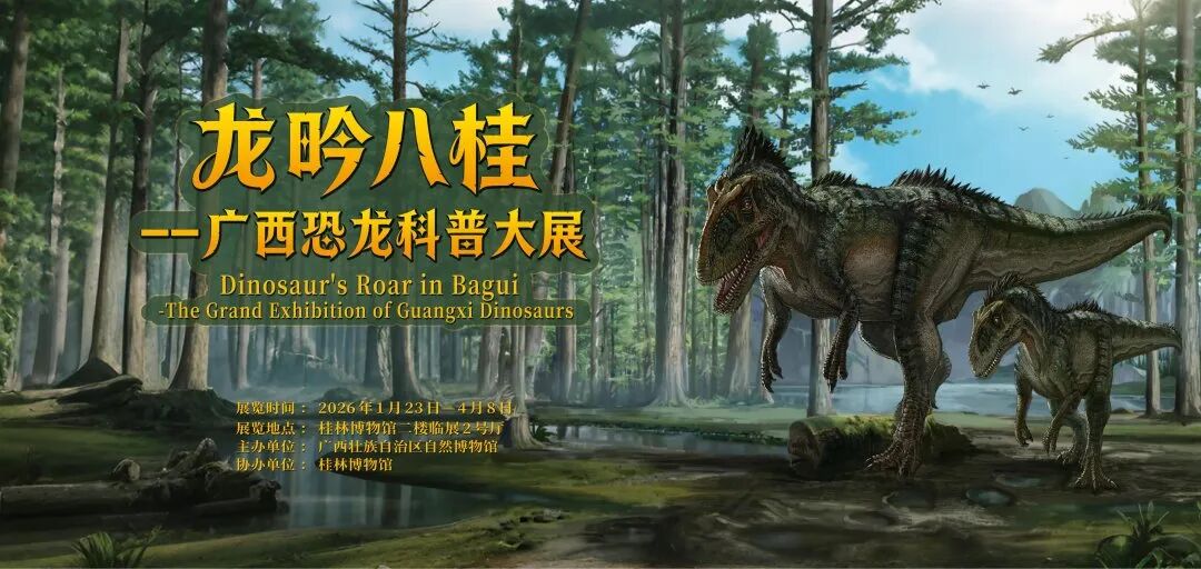 亿万年前,八桂大地曾是恐龙的乐园。它们的骨骼深埋于红土之下,化为时空胶囊,静待唤醒。2026年1月23日,“龙吟八桂——广西恐龙科普大展”将在桂林博物馆重磅启幕,邀您穿越亿万年时空,走进广西恐龙的神秘世界,聆听远古生命的恢弘吟唱。