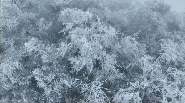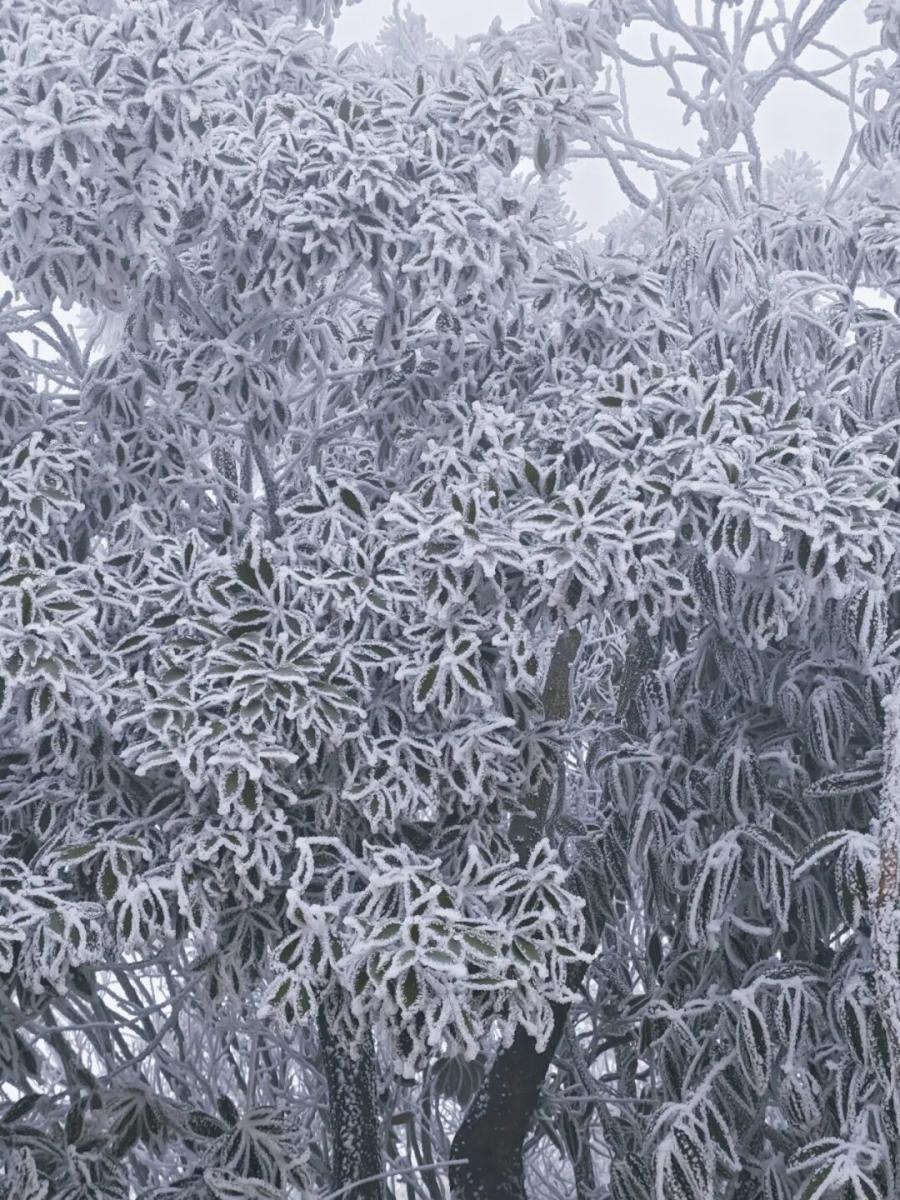 寒冬里,挺拔的青松、低矮的灌丛全都被裹上了厚厚的银装,琼枝玉树,满目莹白,连山间的枯草、石阶都覆着一层细腻薄霜,泛着淡淡的柔光。