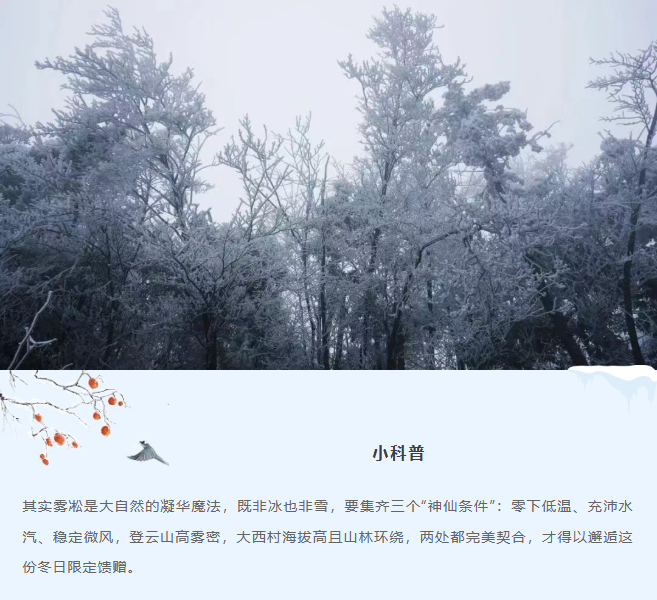 走在其中,云雾缭绕其间,脚下是松软的霜花,身旁是冰清玉洁的景致,仿佛闯入了远离喧嚣的冰雪秘境。