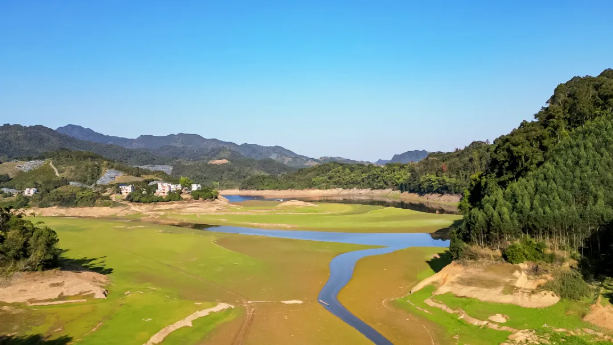 近日,大江水库入选“2025年度广西幸福河湖”名单,其独特魅力进一步受到关注。大江水库水位下降后,露出上千亩天然湿地。虽是深冬,这里仍绿意盈盈,牧草如茵,黑山羊闲步其间,时而传来“咩咩”轻鸣,为静谧山谷注入了鲜活气息。