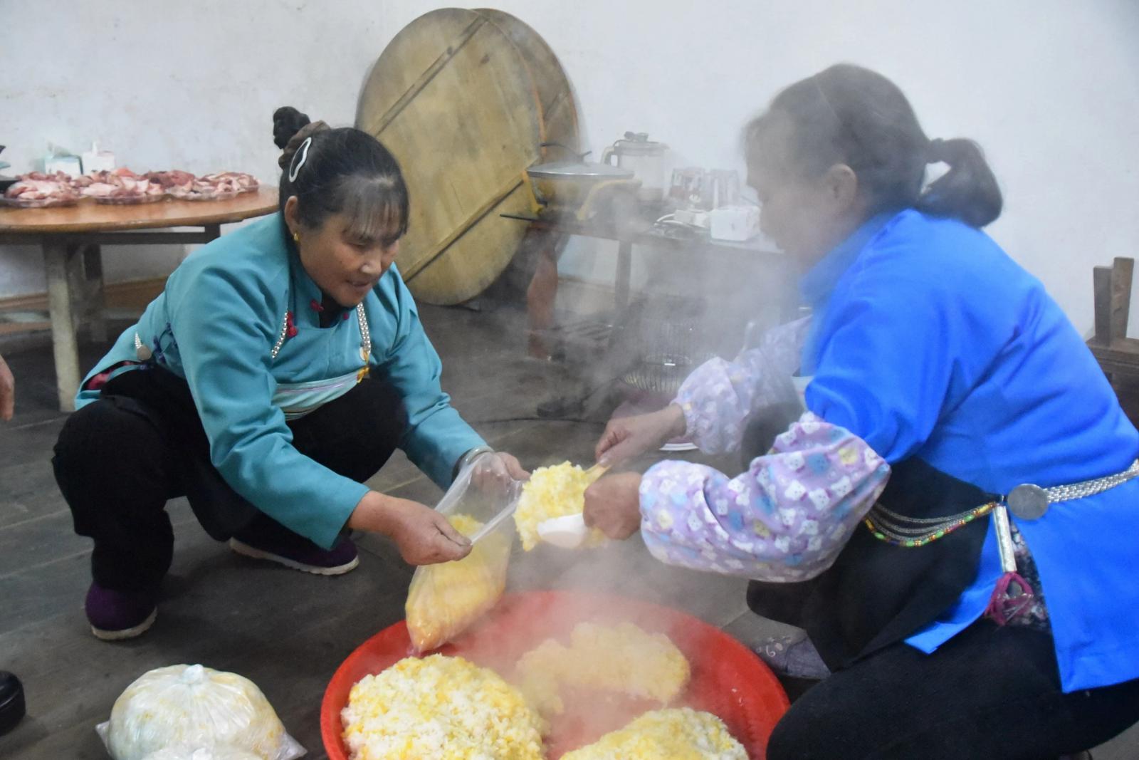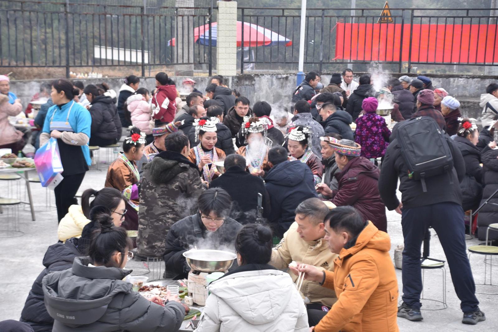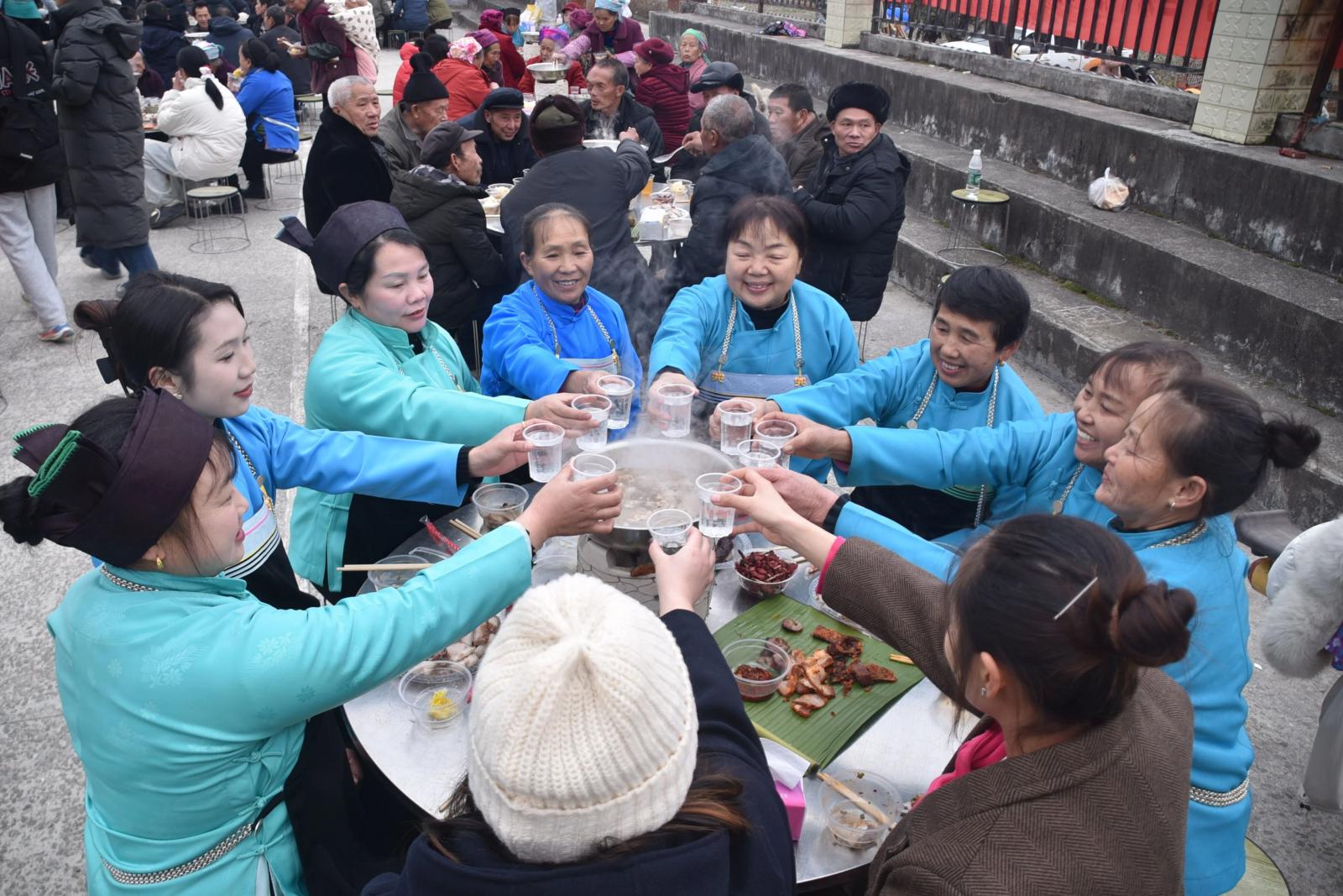 下午,年猪宴正式开始。全村男女老少围坐一堂,热气腾腾的锅边炉,鲜香四溢,村民们举杯畅谈,品尝美食,脸上洋溢着幸福。席间,村民更是热情地端出自家酿造的糯米酒,逐桌敬酒问候,好玩有趣的“高山流水”的敬酒仪式,将苗家待客的真诚与豪爽传递至每一个人手中。