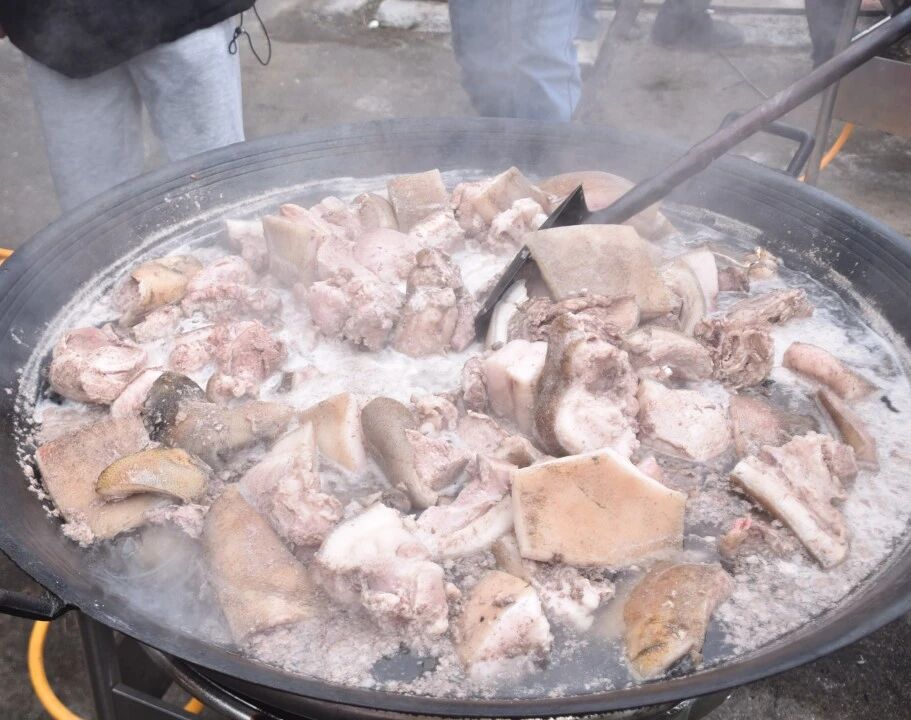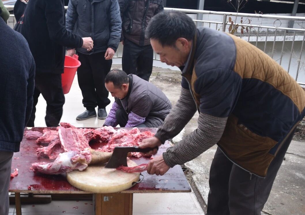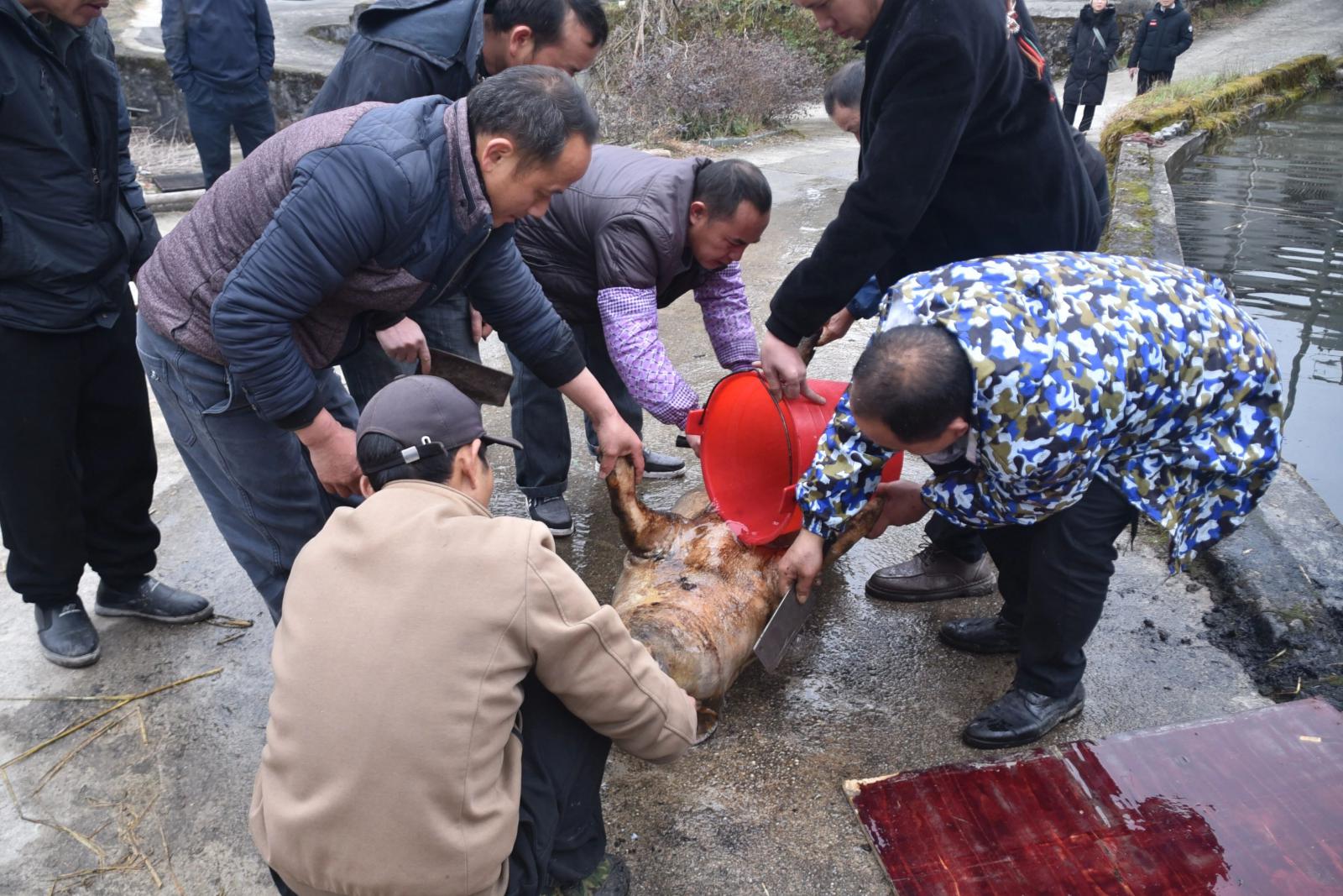 清晨,平浪村已是一派忙碌景象,村民们早早起身,有的负责抓猪、有的负责按住猪脚、有的负责掌刀,大家分工明确,有序进行宰年猪准备工作。待焚香祷告结束后,褪毛、清洗、开膛、分肉,动作麻利干脆,村民们默契得像排练过无数次一样。