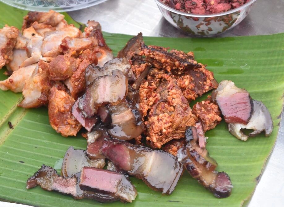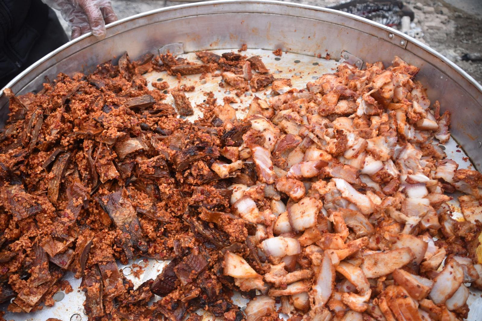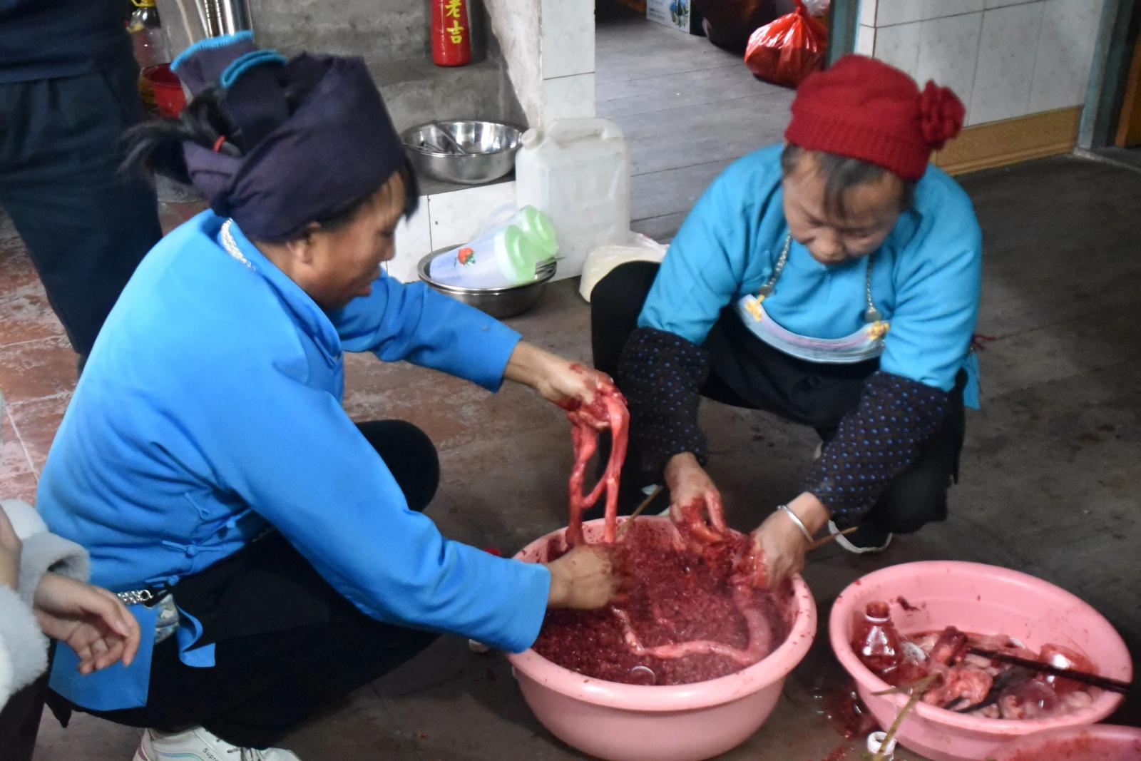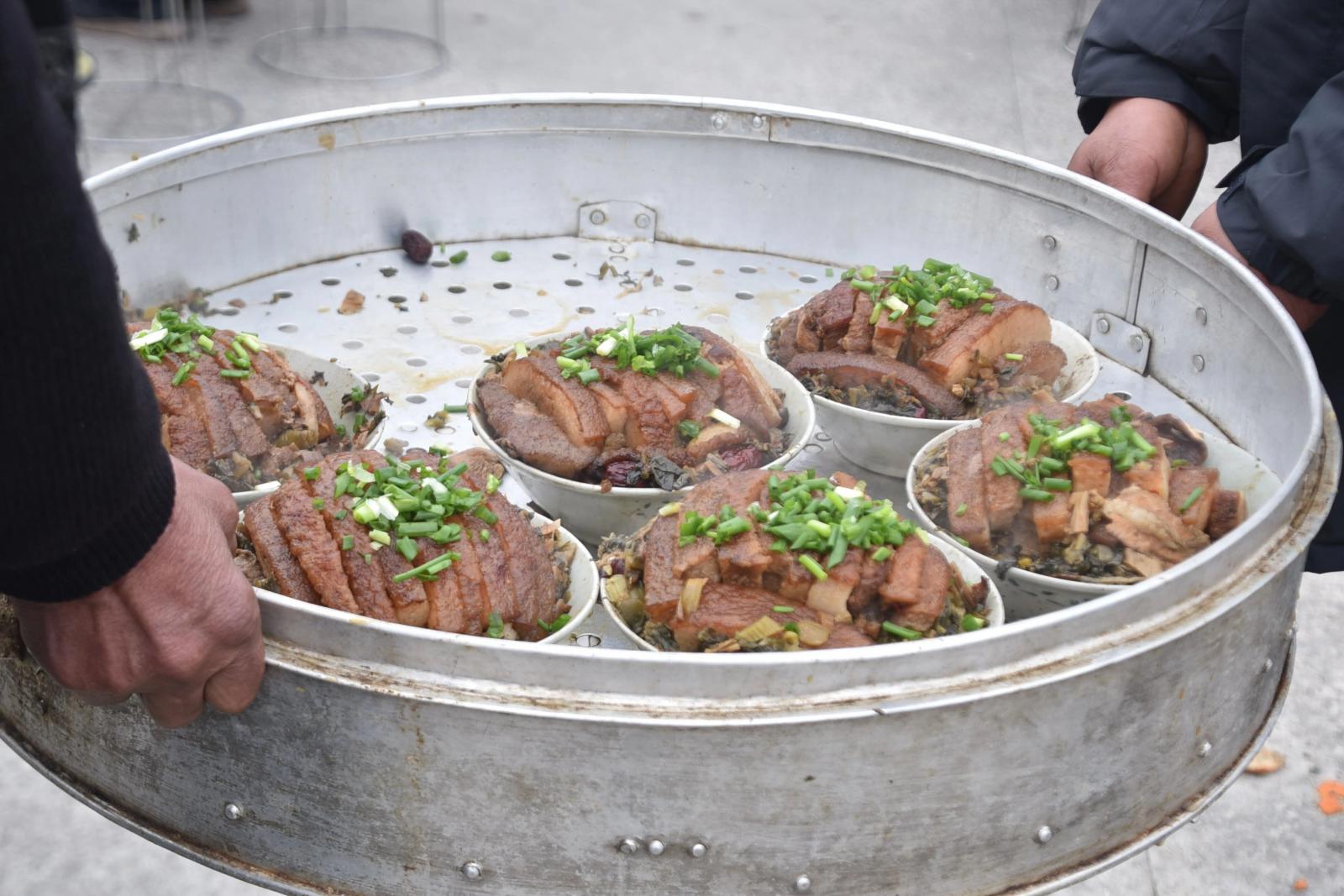 灶房里,柴火噼啪,铁锅上腾起阵阵白雾。油锅漆作响,被炸得两面金黄的猪肉泛着诱人的油光,香气窜出老远,引得人们直咽口水。今年的菜谱格外丰盛:柴火扣肉肥襦酥烂,酸鱼酸肉开胃生津,锅边炉咕嘟冒着热气,糯米血肠软糯咸香,红肉色泽鲜亮,入口即化......每道菜都承载着记忆里的年味。
