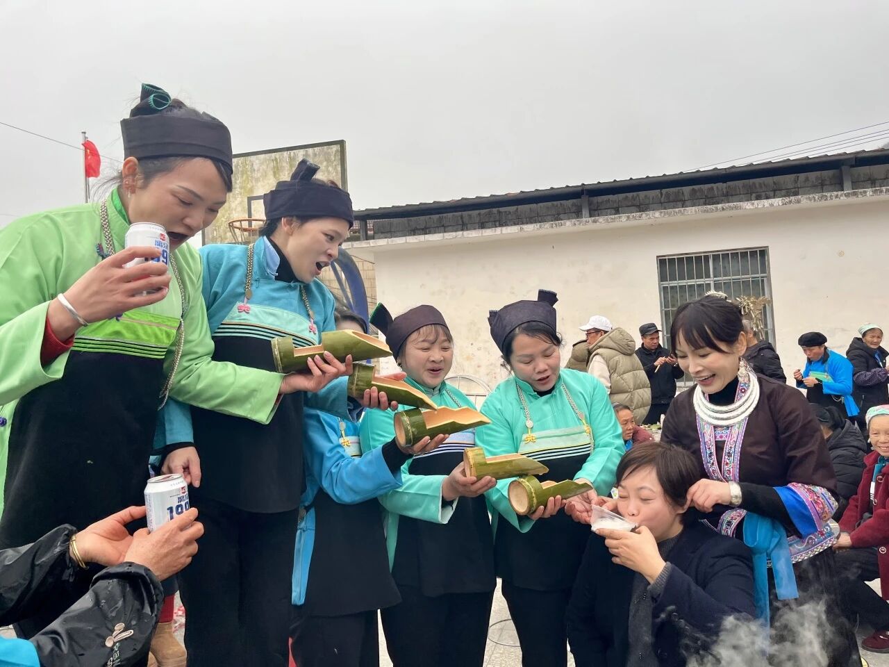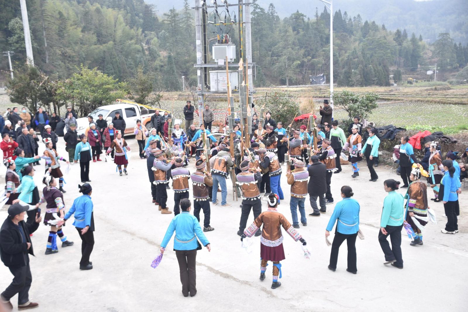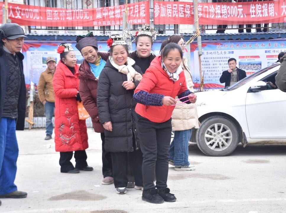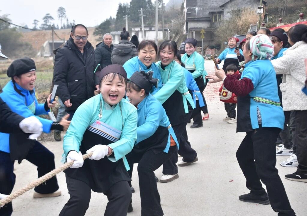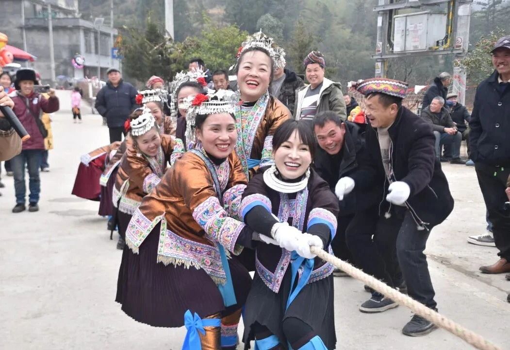 中午,村民们齐聚在村委会旁,吹芦笙、跳踩堂舞、拔河比赛、套圈等特色项目依次进行,现场欢声笑语不断,满是浓浓的年味儿。