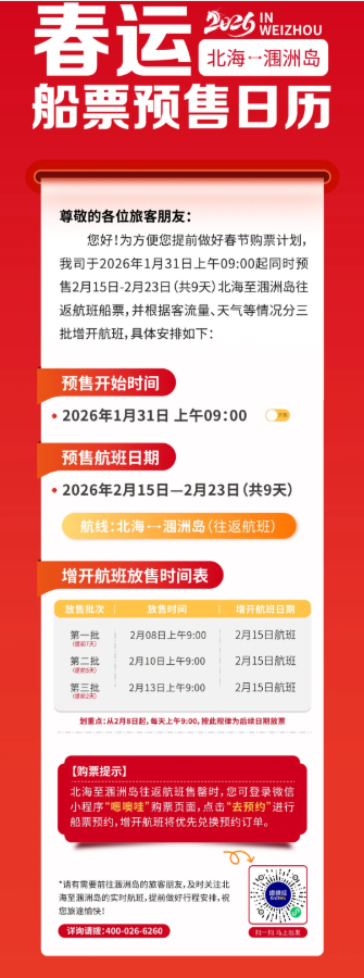据了解,春节北海至涠洲岛往返船票已于1月31日开启预售,本次预售为2月15日-2月23日(共9天)的往返航班船票。后续还将根据客流量、天气等情况分三批次增开航班,旅客朋友们可登录微信小程序“嗯噢哇”查询航班信息及订票。