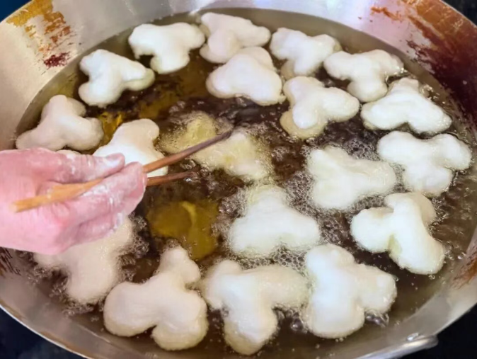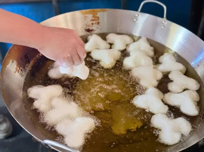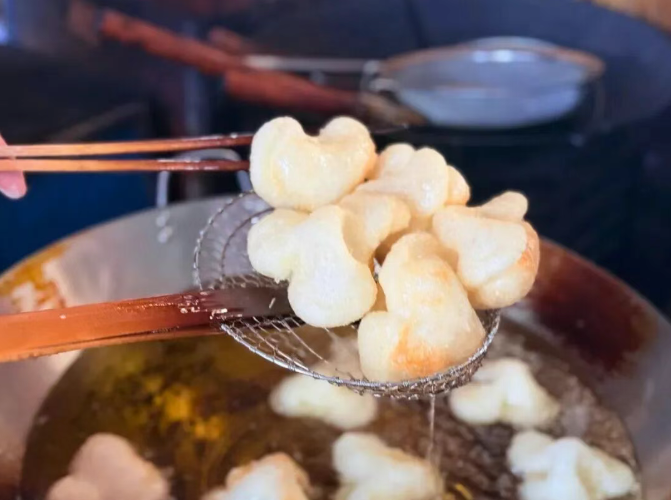 炸制是成就沙堆口感的关键一环,藏着民间手艺人的智慧。“油温是门学问,过高则外焦内生,过低易腻口含油。”卢贵明指尖蘸起清水向锅中轻弹,“噼噼啪啪”的脆响声马上起来。“如果掌握不了油温,就可以用这种办法,这个时候的油温合适下锅。”米团在热油中慢慢膨胀,由乳白色渐变为浅黄。卢贵明用长筷轻拨慢翻,目光始终不离油面。“炸十多分钟,白色翻面,微黄出锅,老火就毁了口感”。