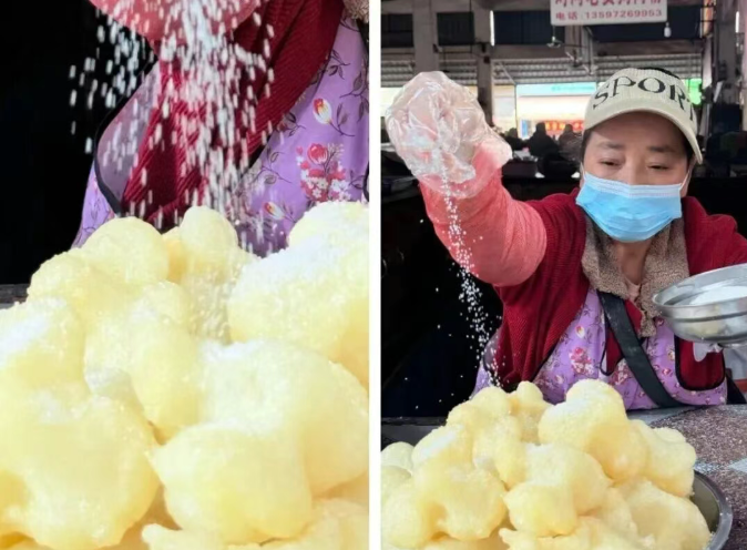 2025年12月17日下午两三点,柳城县东泉街农贸市场人声喧嚷。卢贵明与妻子的小摊前,一股诱人的甜香随油锅热气飘散开来。大铁锅里,菜籽油泛着金光滋滋响。卢贵明站在油锅旁边,双手用力地在盆子里揣一大团米浆,手腕轻转间,一个个雪白温润的米团被轻轻放入油锅,“滋啦”一声,细密的油花欢腾绽放。