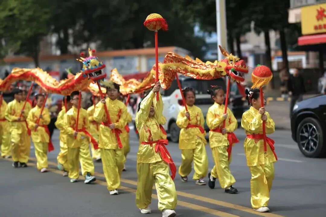 内容:福龙、双狮和金童、玉女巡游古镇,给大家拜年。