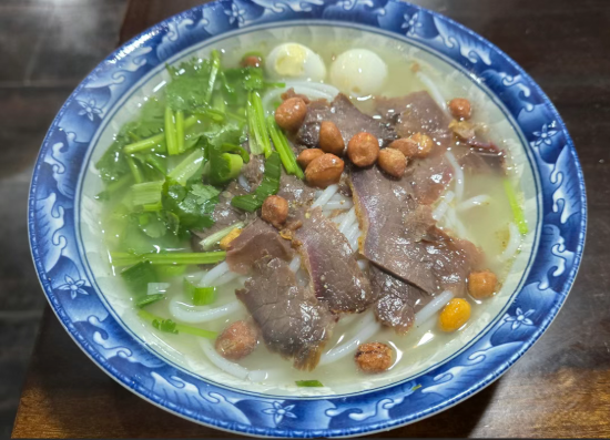 端起小碗,先啜热汤,汤色乳白,入口醇厚,带着马骨熬出的天然鲜甜。再尝腊马肉,薄如蝉翼,入口细嫩,越嚼越香,滋味赛过上好的火腿。吸饱了汤汁的米粉爽滑Q弹,顺喉而下,吃得人微微发汗,通体舒泰。