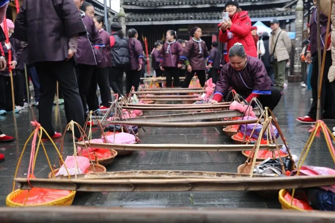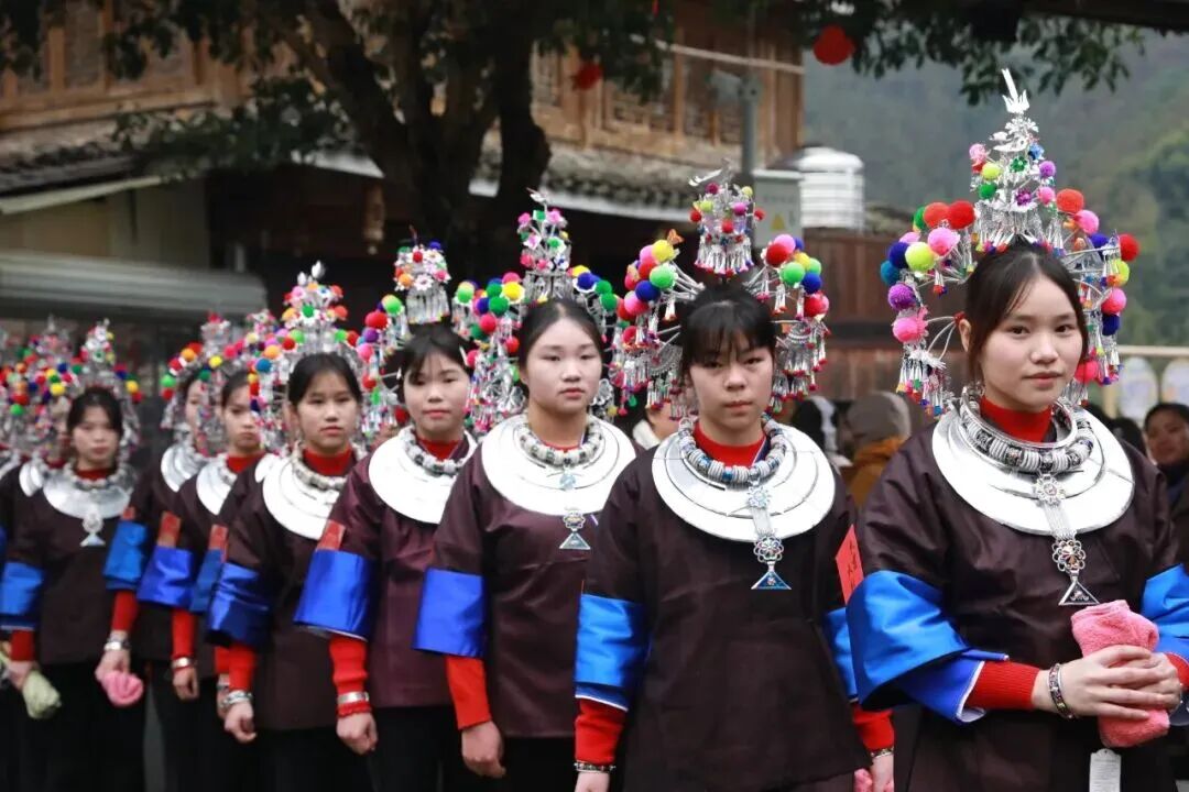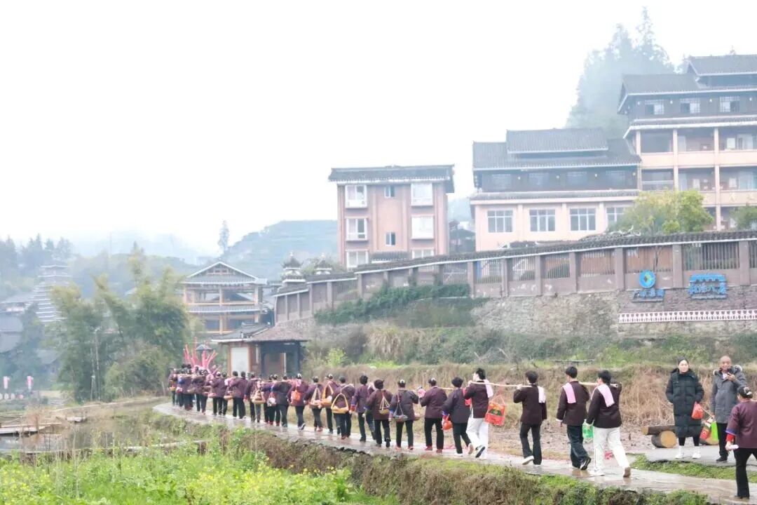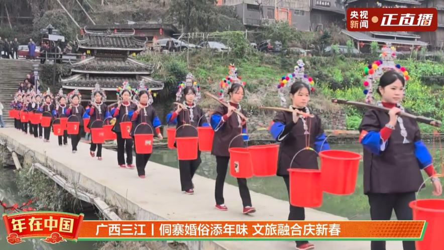 2月19日大年初三,三江侗族自治县林溪镇程阳八寨景区举办“新娘回门”传统婚俗活动。送亲队伍身着侗族盛装,挑着酸鱼、酸鸭、糯米、侗布等贺礼送新娘回门,浓郁民族风情吸引众多游客前来观赏,成为新春侗寨一道特色文旅风景线。