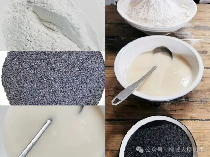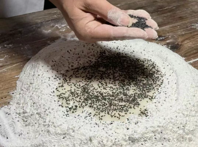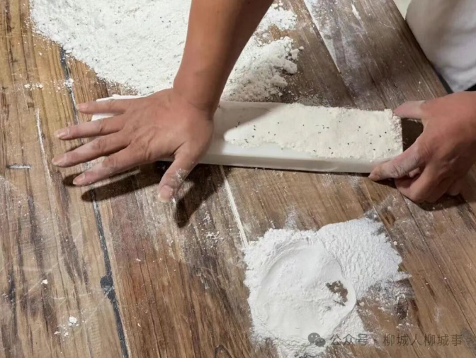 翻拌的过程中,廖荷辉拿起两把灰铁刮板,对着粉团反复切压,黑芝麻便均匀嵌进米粉里。“力道得像给小孩拍背似的轻。”他手腕转动间,粉团已泛出芝麻斑点,“要是使劲揉,米粉起了筋,米饼咬着就发死,没那股松软劲儿了。”廖荷辉说,他这手“轻压慢拌”的功夫,是跟着母亲学手艺时最磨人的一课。“那时候我总急着出活,母亲就拿木棰敲我手背:‘米饼是吃香的,不是吃力气的’。”