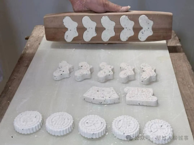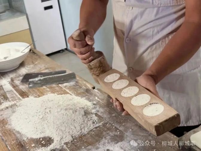 最见功夫的是压模。饼模登场时,廖荷辉的动作多了几分郑重。他将粉团填入刻着“喜”“财”“兴”“福”等字样的模子,用掌心轻扣模面压实,再抓起木棰对着模子“咚”地一敲——带着清晰字纹的米饼应声落在案板上。