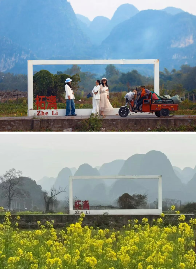 “柘漓树先生”导航至此,可观赏一棵姿态独特的孤树矗立在金色油菜花海中的景象。目前已有部分小花,花期通常盛放在3月中旬至4月初。清晨或傍晚光线最佳,适合拍摄大片。