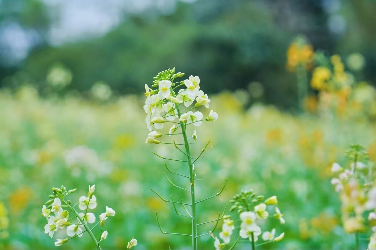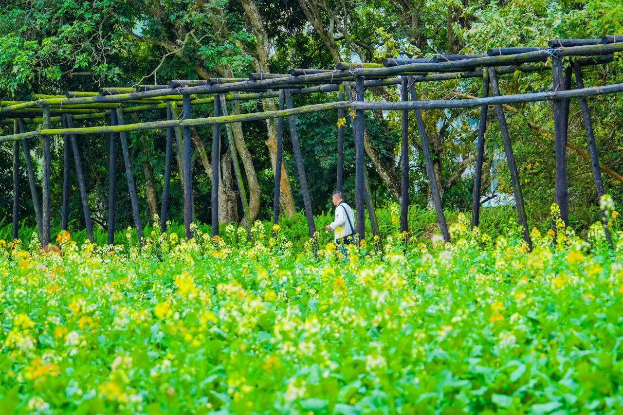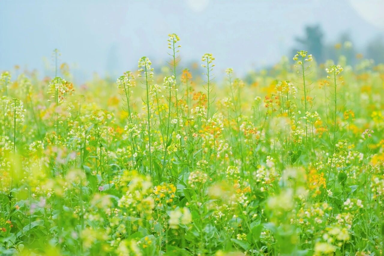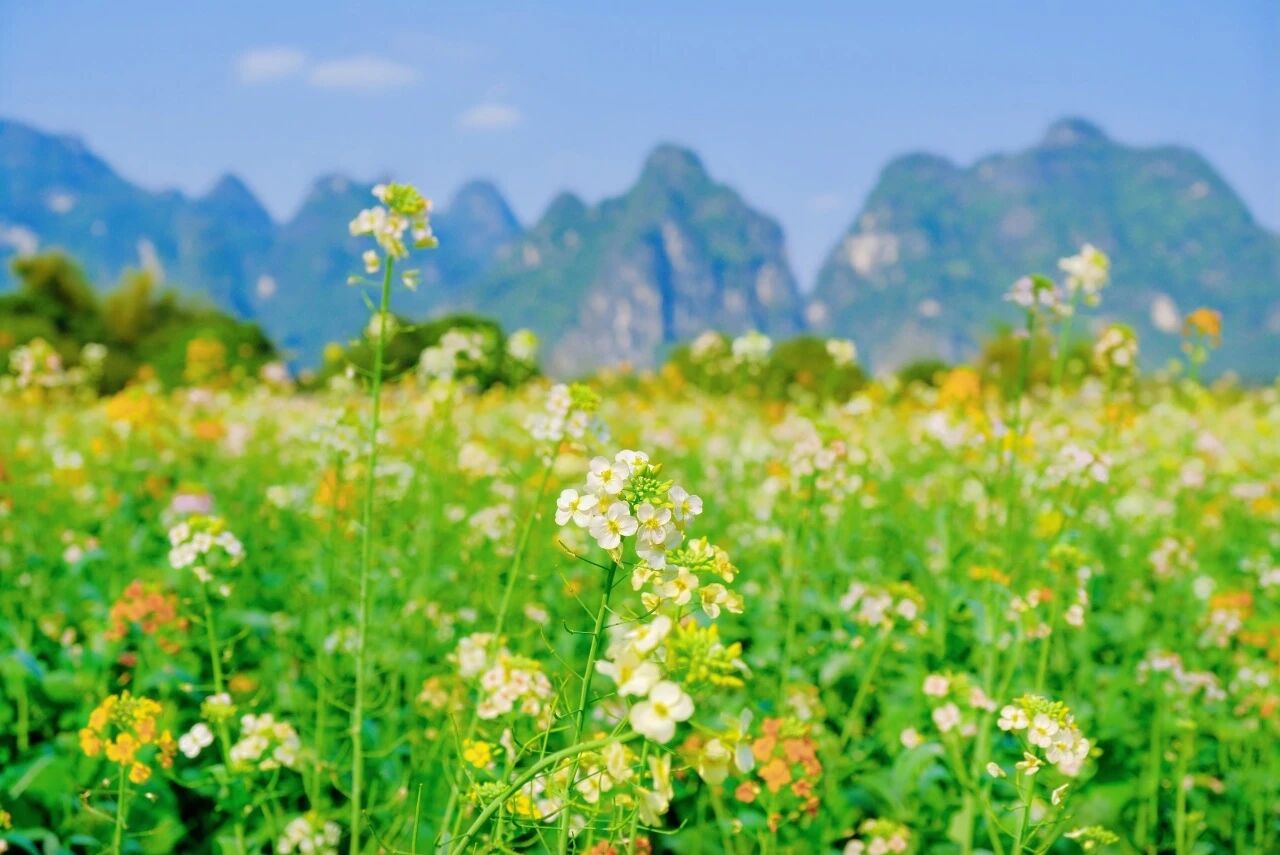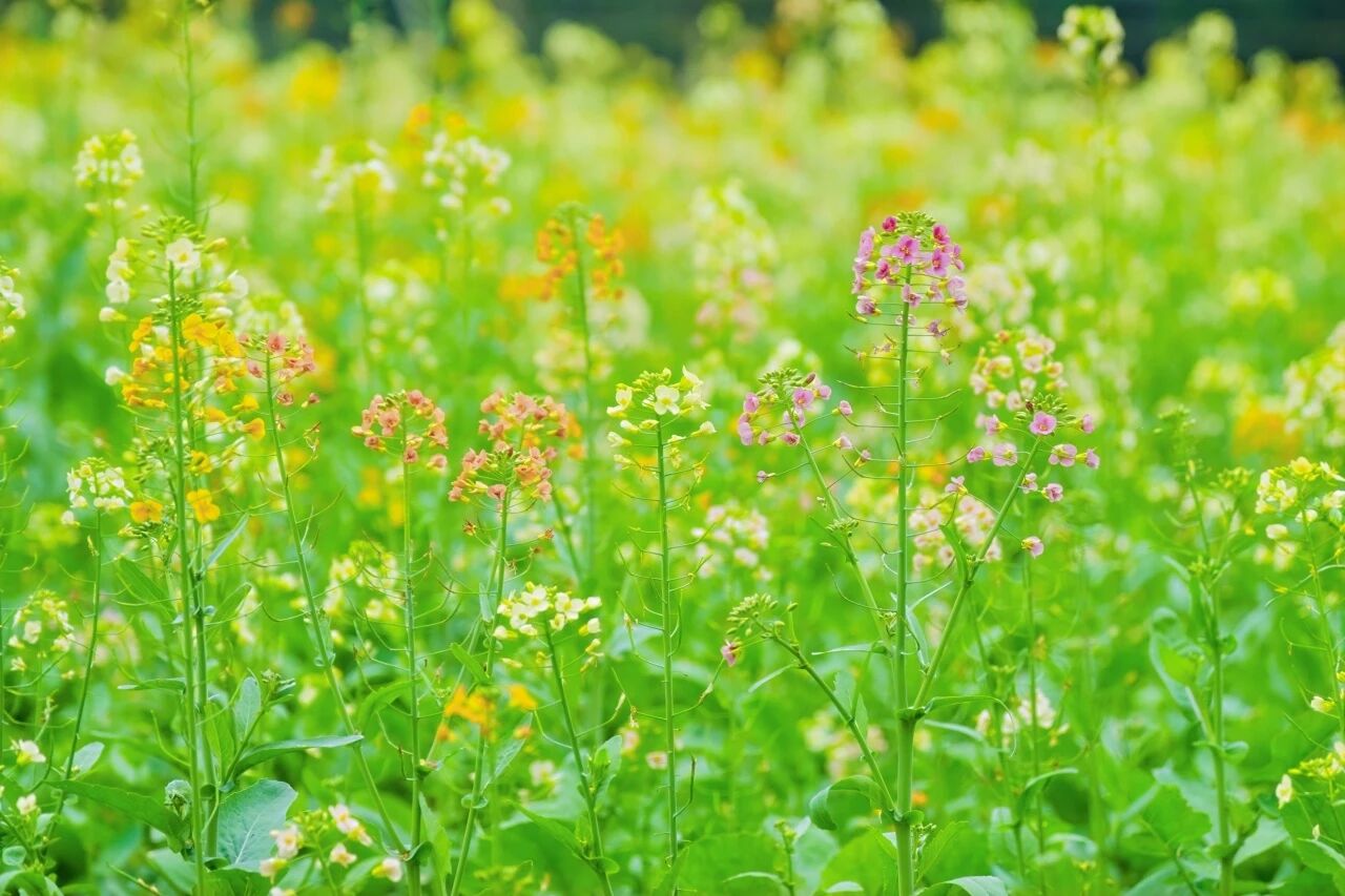 随处可见油菜花绽放,粉的、白的、紫的、橙的、黄的……一幅诗意而明媚的彩色画卷,在天地间铺排。