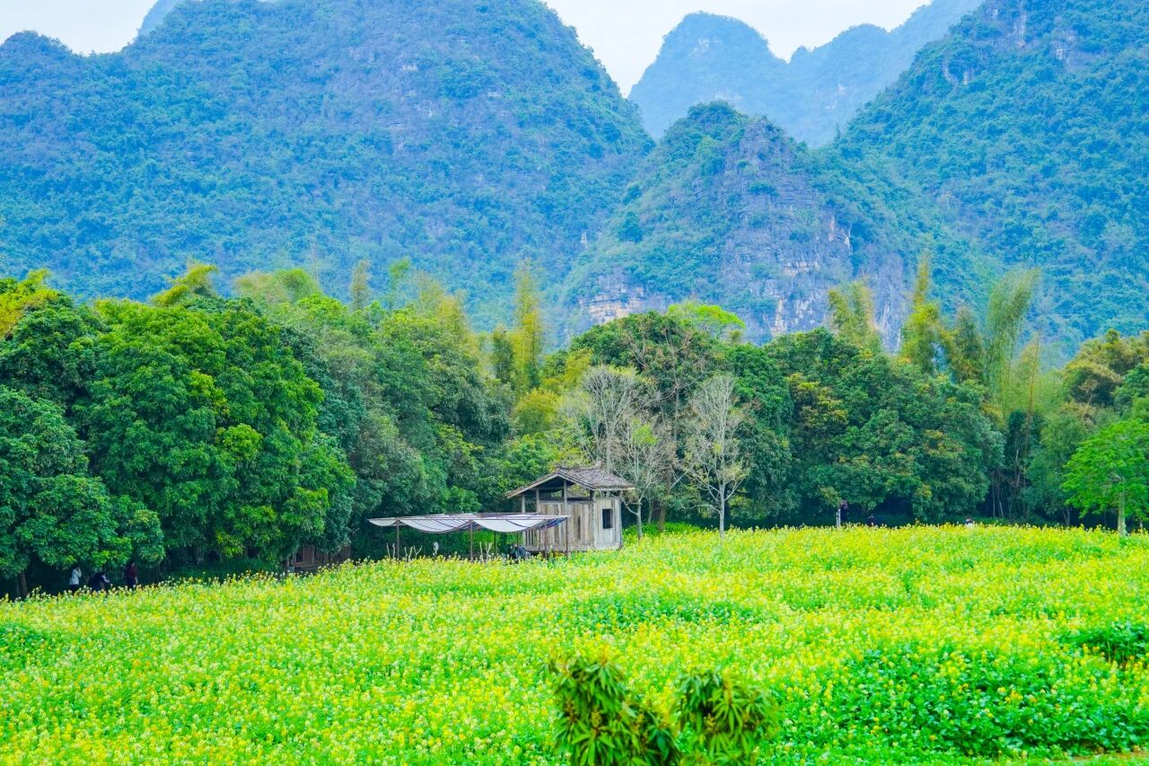 这里的油菜花已花开成海,在澄澈明净的天空下,彩色一片,镶嵌在万顷花田之中,无边无际。在花海里还可以看见远处的木屋。