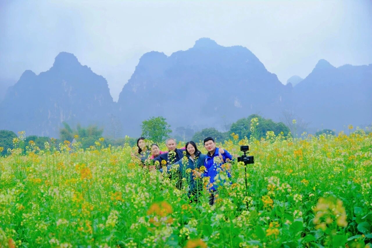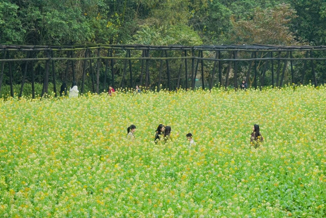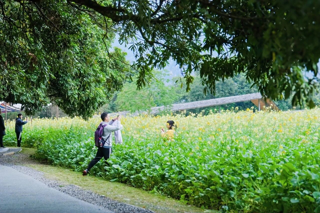 游客们漫步在油菜花田中,温暖的阳光洒在脸庞,淡淡的花香沁人心脾。