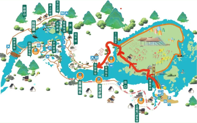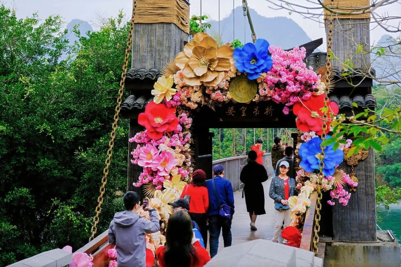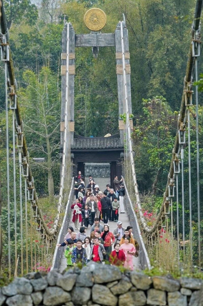 陆路游线:从安平游客中心入口出发,抬头眺望可见婆皇吊桥,行走其间,可打卡花样景致和仙河美景