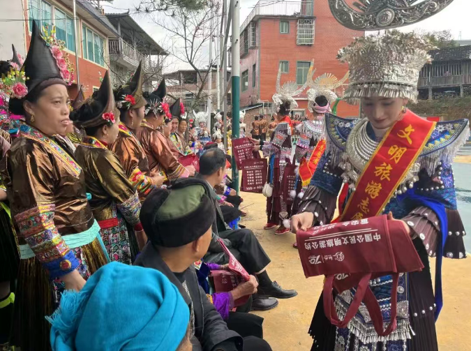为保障盛会安全有序、彰显乡风文明,融水在坡会期间开展文明旅游宣传工作。现场通过宣传引导、志愿服务等举措,倡导游客尊重民族习俗、爱护生态环境、遵守公共秩序、文明观赏互动,共同营造文明和谐的旅游环境。