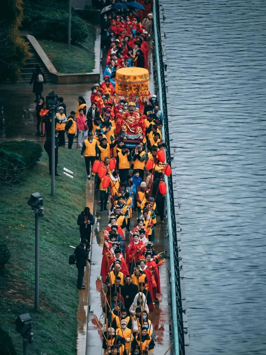 点睛仪式后,出游队伍将从善缘广场出发,抵达八龙壁,将龙王安放至“八龙现江壁”中间坐台,完成九龙归位仪式,全程约2.5小时。其中精彩的看点便是按古礼排布的仪仗方阵和古今交融的表演方阵。