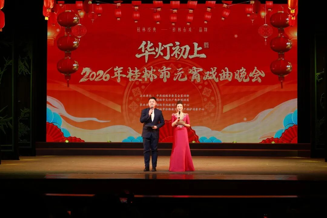 月满漓江畔,火树银花合;万家灯火时,好戏正开场。3月1日、2日晚8时,由中共桂林市委员会宣传部、桂林市文化广电和旅游局主办,桂林市戏剧创作研究中心、桂林市非物质文化遗产保护传承中心承办的“华灯初上”2026年桂林市元宵戏曲晚会,在广西省立艺术馆华彩上演。两场演出吸引近千名市民游客走进这座城市文化地标,在古朴戏韵中共度元宵佳节。