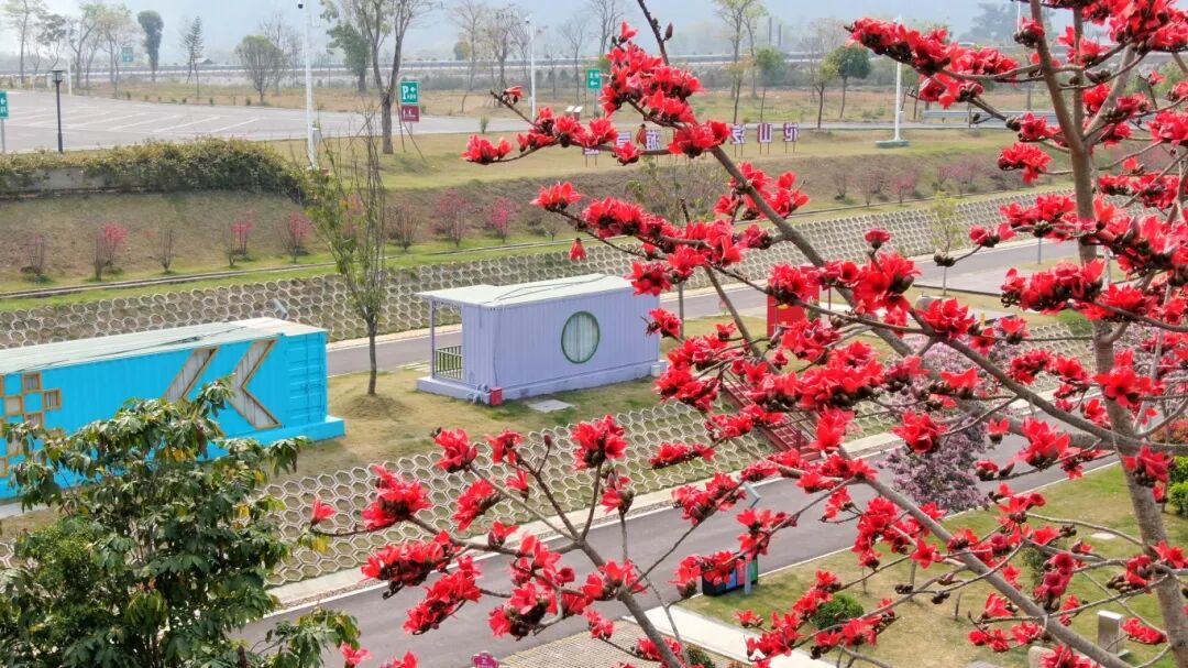 从花山服务区收费站驶出,仿佛一头扎进了宫崎骏的漫画里。这里没有城市的喧嚣,广阔天地被左江温柔地环抱着。春天的营地,是花的主场。木棉花、桃花竞相开放,连空气中都弥漫着清甜的花香。