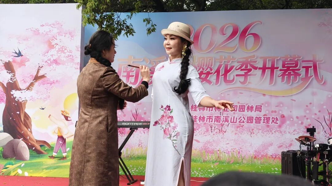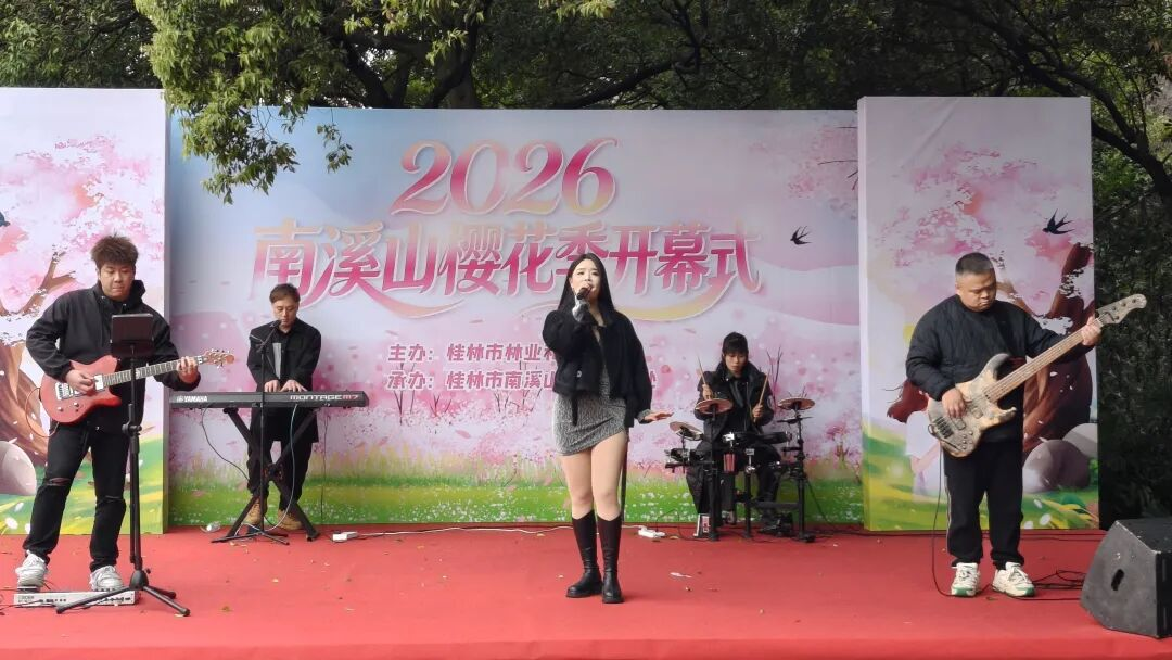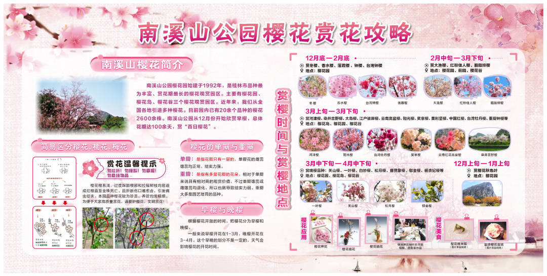 南山公园是桂林市区AAAA级景区。近年来,公园不断引进新的樱花品种,目前园中已种植樱花20多个品种,总数达2600株,眼下盛开的有中国红樱、红粉佳人等。