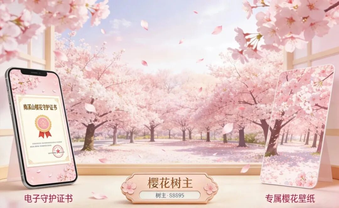 作为本届樱花季的重要活动之一,主办方还精心策划了樱花守护活动。樱花季期间,大家可有偿认证一颗樱花进行守护。成功认证后,将获得电子守护证书、专属樱花壁纸,樱花树旁将悬挂上专属的“树主联名名牌”,把春日的美好与浪漫长久珍藏。