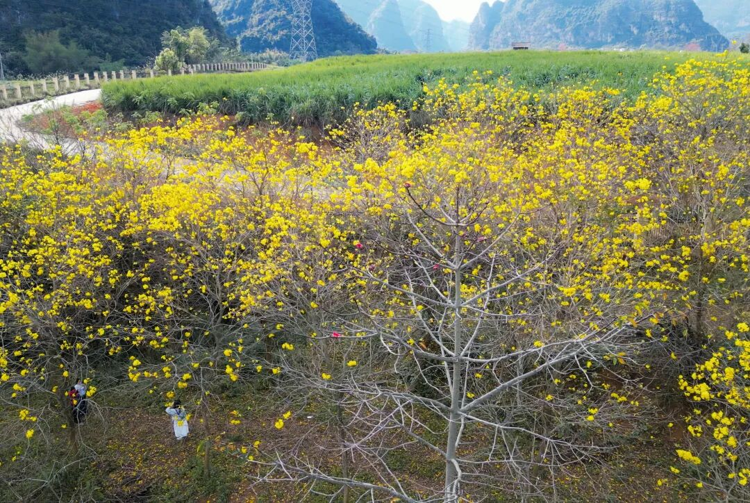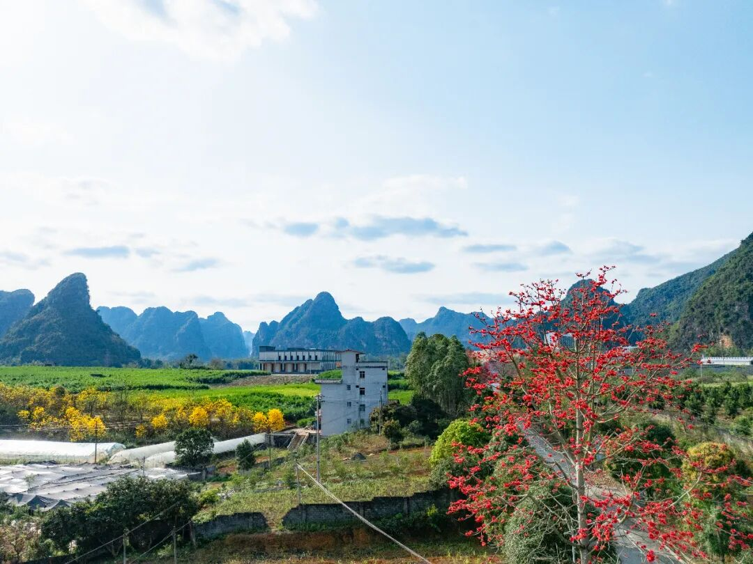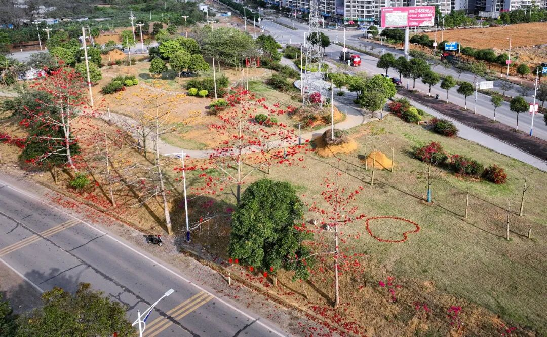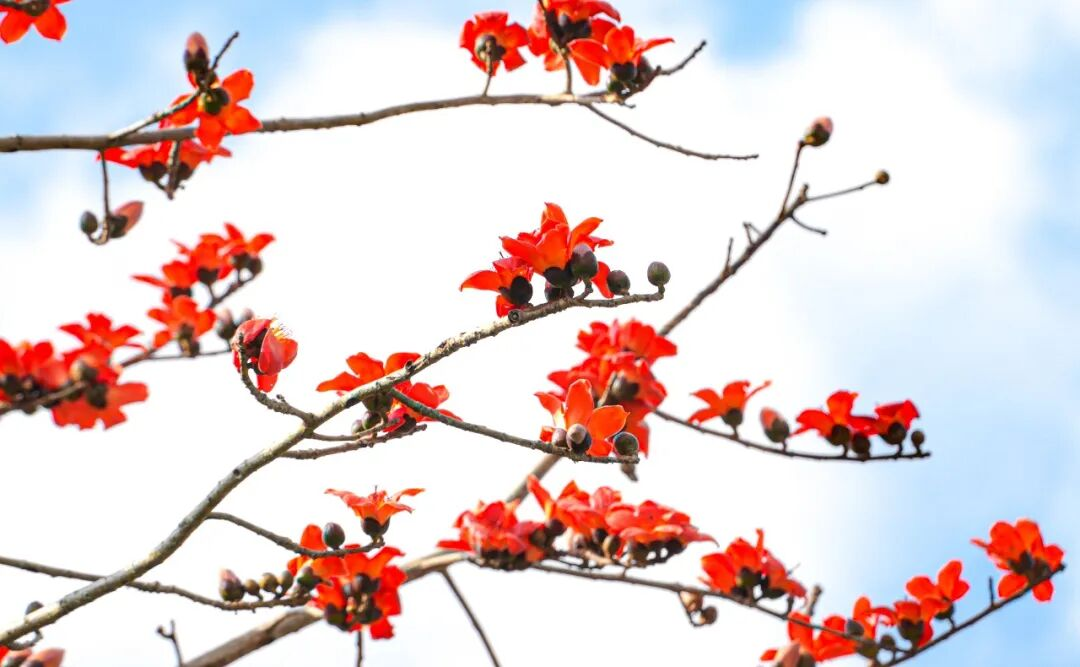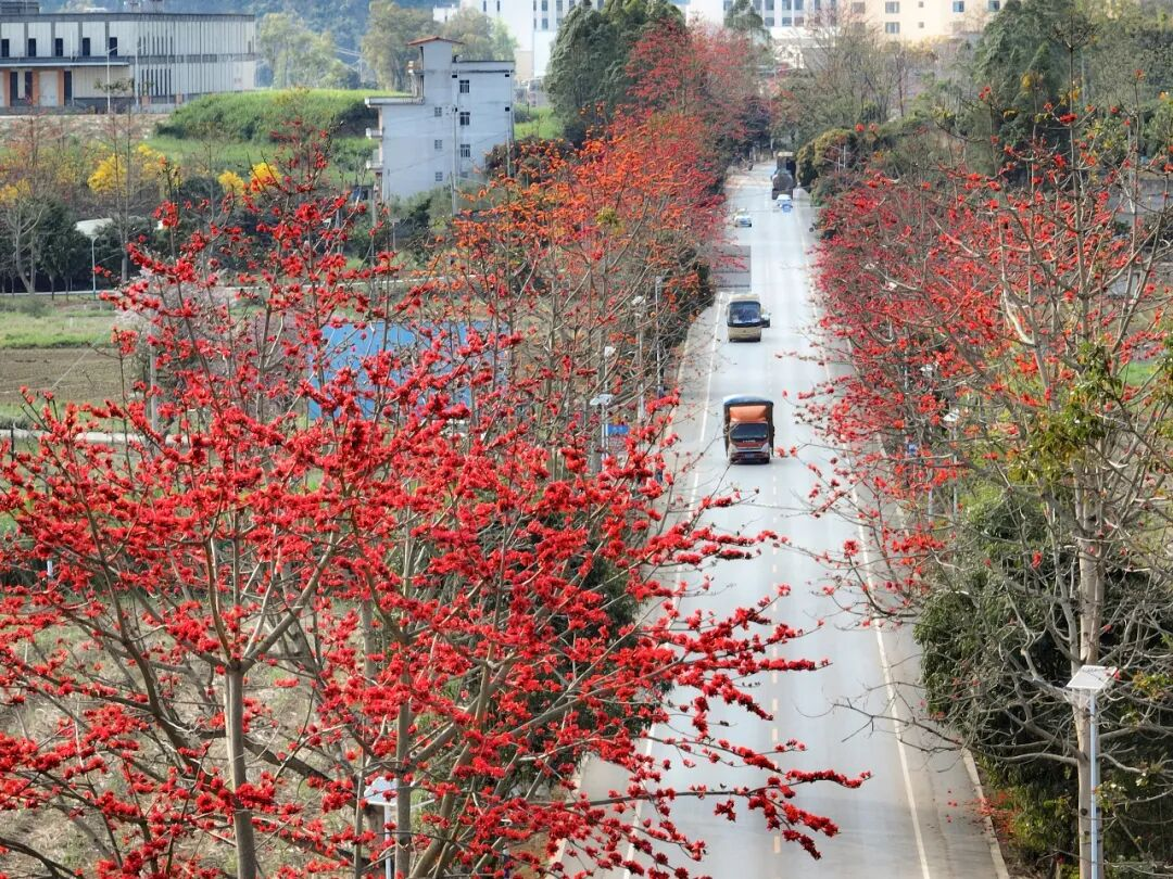 高大的木棉树开满火红花朵,无叶映衬更显娇艳夺目,热烈绽放的“英雄花”,与浓沙的山水田园相映成趣,成为春日里最亮眼的风景。