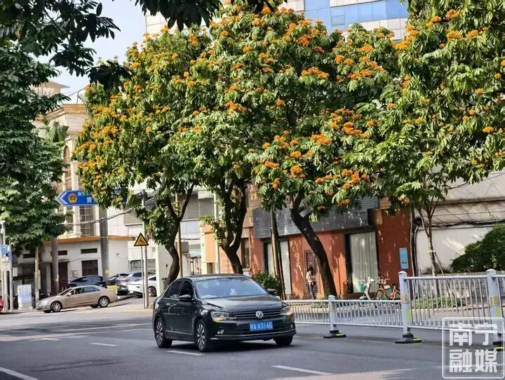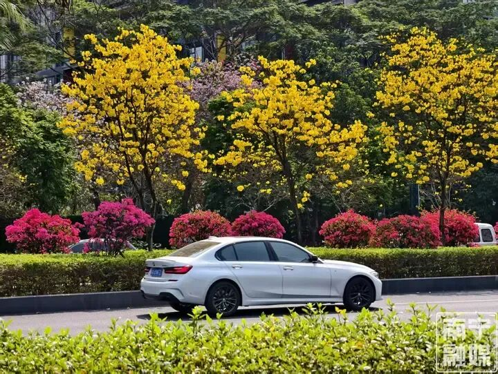 在五象新区,黄花风铃木、洋紫荆热烈绽放,大气又极具现代感的街景与花海相映,车行其间,仿佛闯入了一幅色彩斑斓的画卷,明媚又治愈。