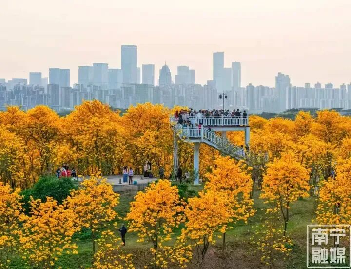 青秀山风景区里,7000多株黄花风铃木满枝金黄,如同一串串风铃在风中摇曳,奏响春日的乐章,吸引了数以万计的“赏花大军”前来踏青赏花。