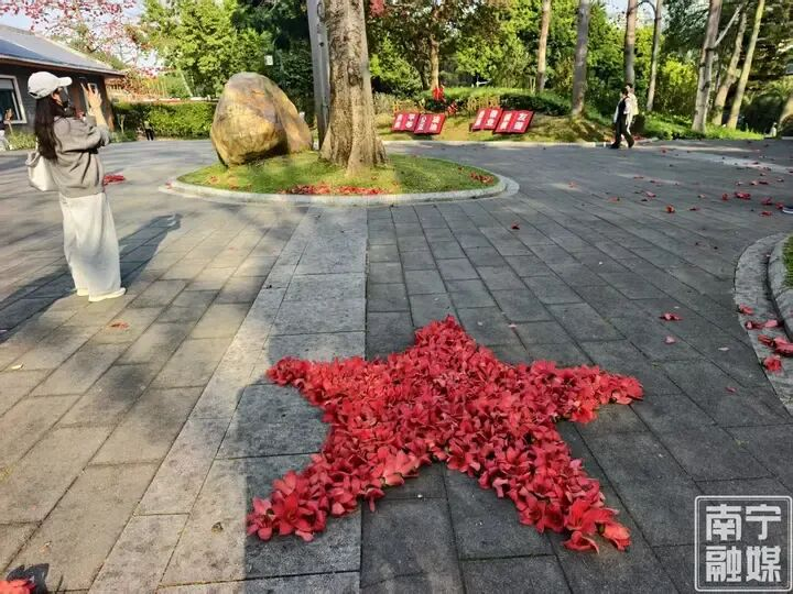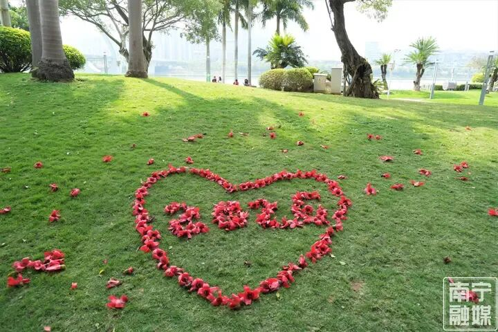 山如黛,水清碧,在邕江之畔,木棉花如火似焰,油菜花沿江岸铺展,美到相机都装不下。欣喜的游人纷纷将掉落的木棉花归拢一处,摆出“爱心”“2026”等组合图样,身后的一江春水,缓缓流淌,与春日宁静美好不期而遇。