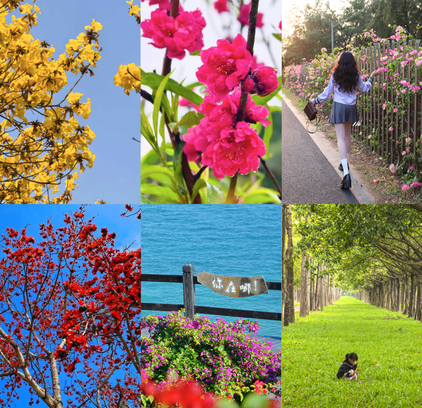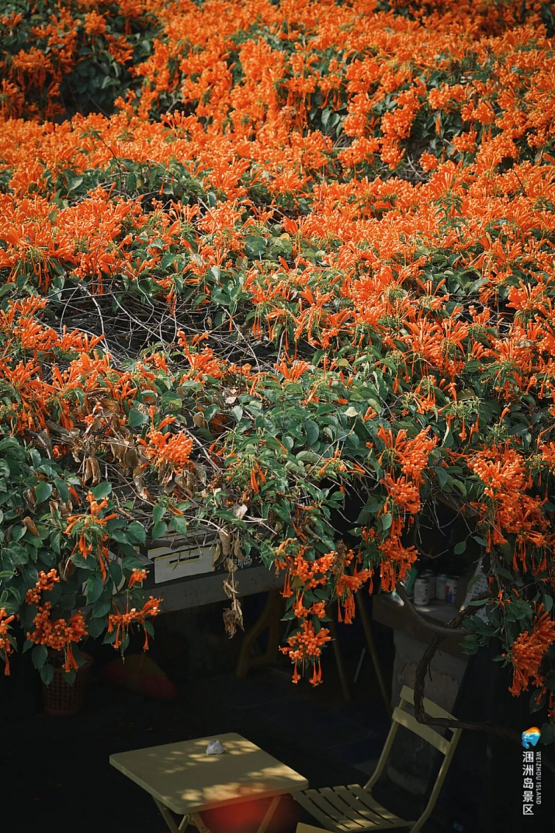 涠洲岛的春天更如一幅流动的油画。鳄鱼山公园里,红紫相间的三角梅尽显娇艳之姿,携手碧海蓝天绽放出春日色彩;相思湖畔,百日草在湖光中盛放,云朵勾勒出动漫般的笔触;村落街道旁,鲜艳的炮仗花垂落在珊瑚民居上,与白洋紫荆的点点素白相映成趣。春夏悬崖花园如法式庄园般优雅,生长在悬崖上的各式花卉竞相绽放,沿着蜿蜒小径,每一朵花都在诉说着春天的故事。在这座海岛上,春天不是某个具体的景点,而是环岛骑行时扑面而来的每一缕暖阳与春风。