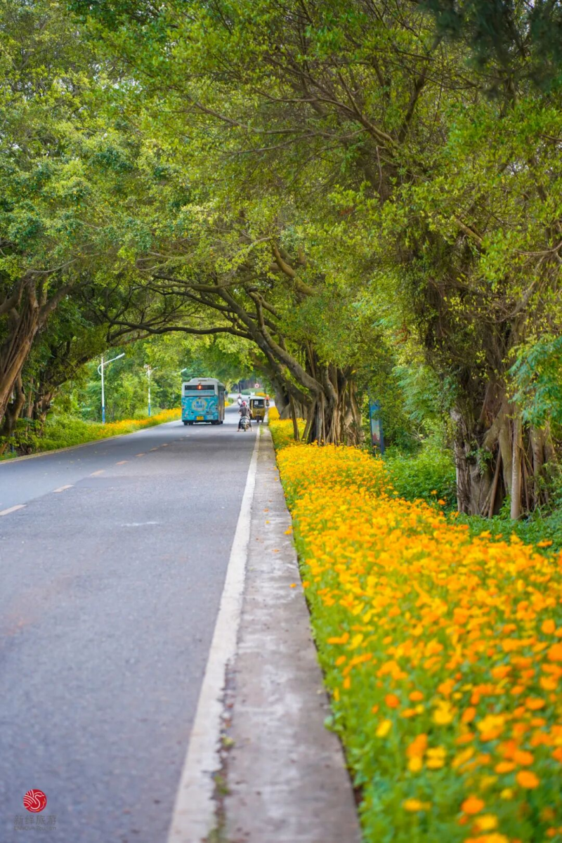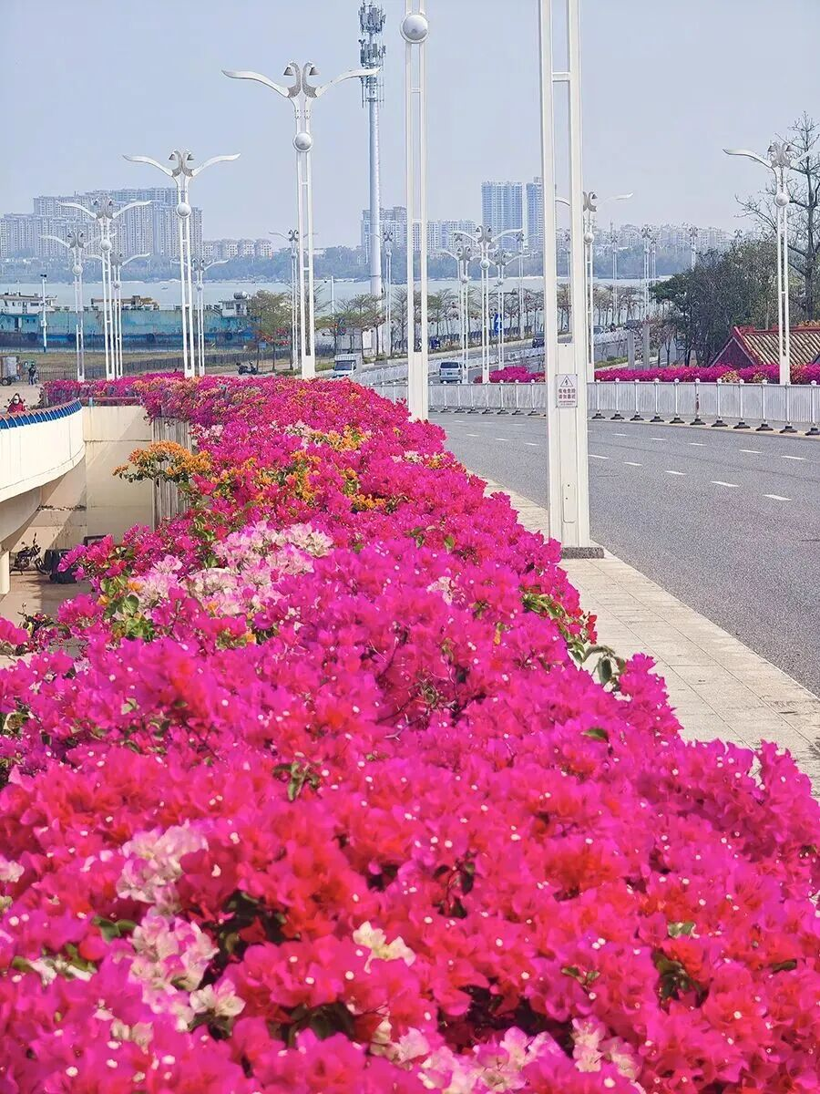 自外沙岛蜿蜒至高德古镇,这条全线贯通的滨海景观道宛如徐徐展开的绝美画卷。木棉擎起满树火红,自海景广场燃至民权路口袋公园,橙红花朵如炬映天,热烈又坦荡。市花三角梅则把烂漫发挥到极致,高德大桥两侧,红、紫、粉交织成片,开得肆意张扬。风过处,花影摇曳,与海面波光相融——漫步桥上,满目皆是撞入心怀的惊艳。