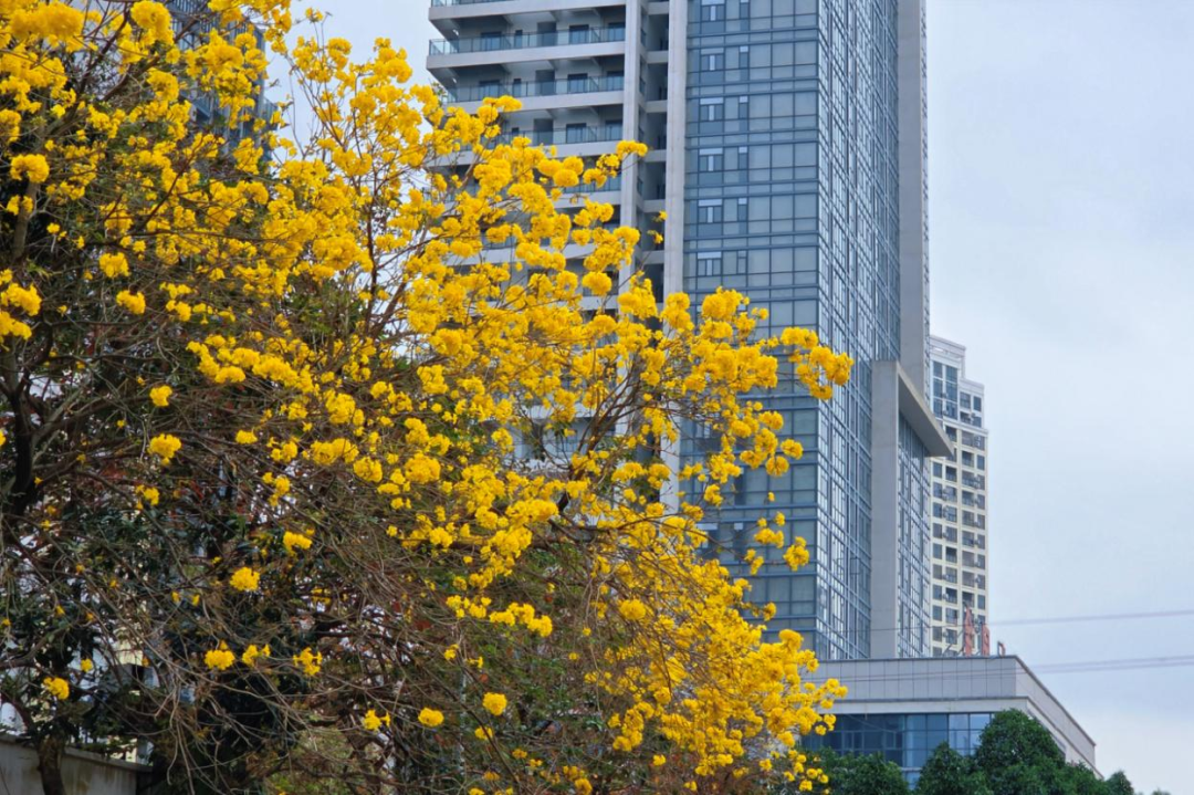 若说木棉是热烈,三角梅是烂漫,那黄花风铃便是温婉的点睛之笔。金海岸大道、南珠大道上,约6000株黄花风铃木正值盛花期。满树金黄的花朵簇拥枝头,在暖阳下闪闪发光,车行其间,宛若穿行在流光溢彩的春日画卷中。