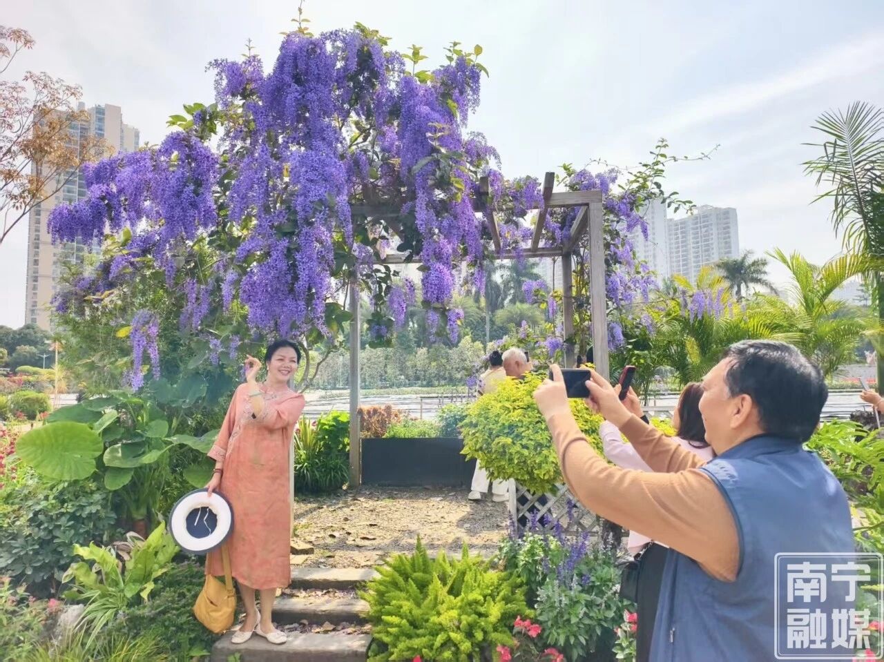 草长莺飞,春色如诗,南宁市花卉公园的蓝花藤火了,吸引了很多人去打卡。走进公园花卉科普展示中心及北门月季园,只见在廊亭之上斜卧着一大丛盘根错节的藤本植物,沿着藤蔓之上,长满了密密匝匝的蓝紫色花朵,垂坠成梦幻紫色瀑布,花朵艳丽,风姿绰约,在阳光照耀下更美丽,无需滤镜,随手一拍就是春日大片。