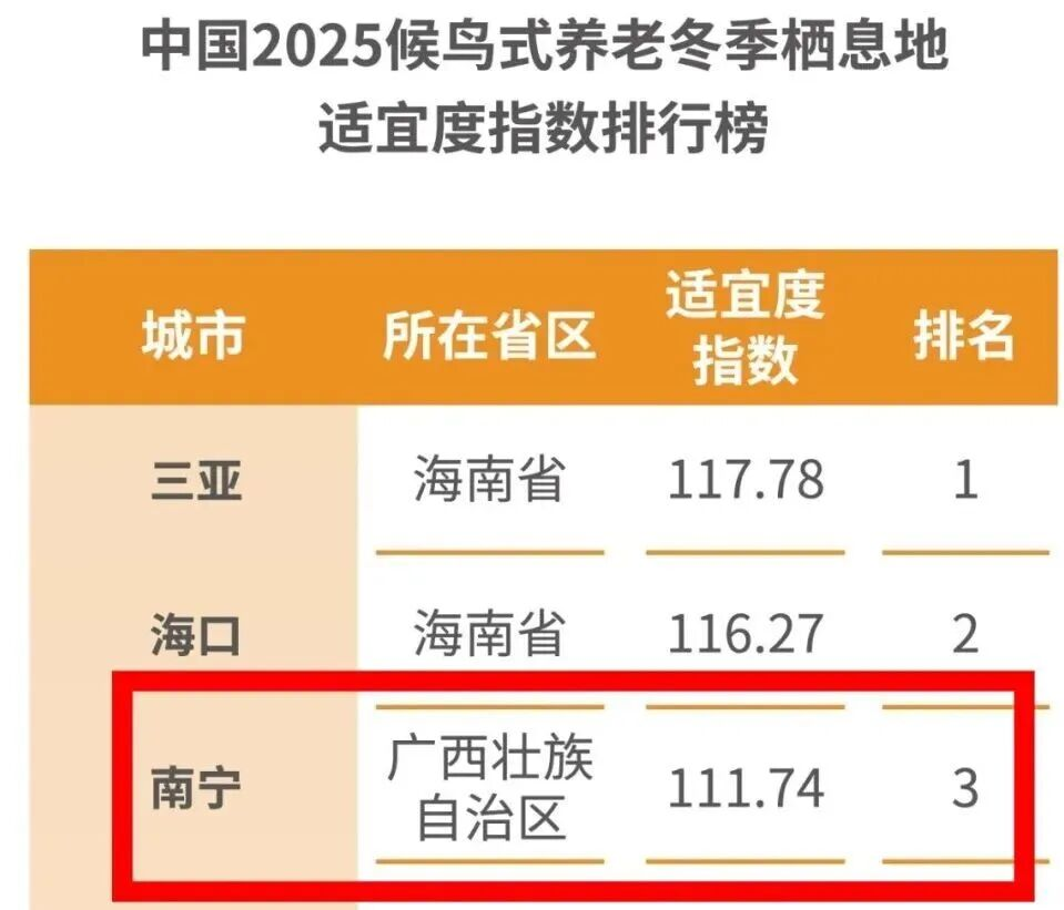 南宁地处北回归线以南,冬无严寒夏无酷暑,四季绿树常青、繁花似锦。2025年12月1日上海交通大学行业研究院发布的《2025中国候鸟式养老冬季栖息地适宜度指数》中,南宁凭借全方位的实力,稳居全国最适合过冬城市前三甲。