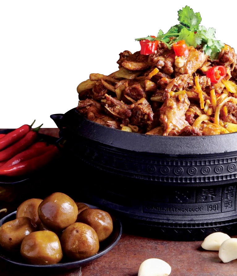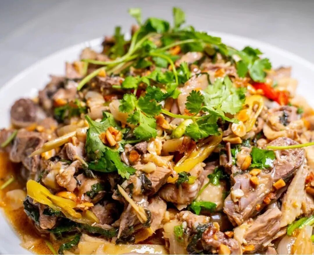 柠檬鸭:用酸藠头、酸姜、酸辣椒和咸柠檬焖炒鸭肉,鸭肉紧实,酸辣浓郁,柠檬清香回味悠长。