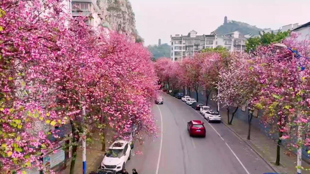 此外,在玉林、贺州等地的公园里、道路旁,樱花、黄花风铃木、三角梅等绚丽绽放,吸引市民和游客拍照打卡,为城市勾勒出明媚鲜活的春日盛景。