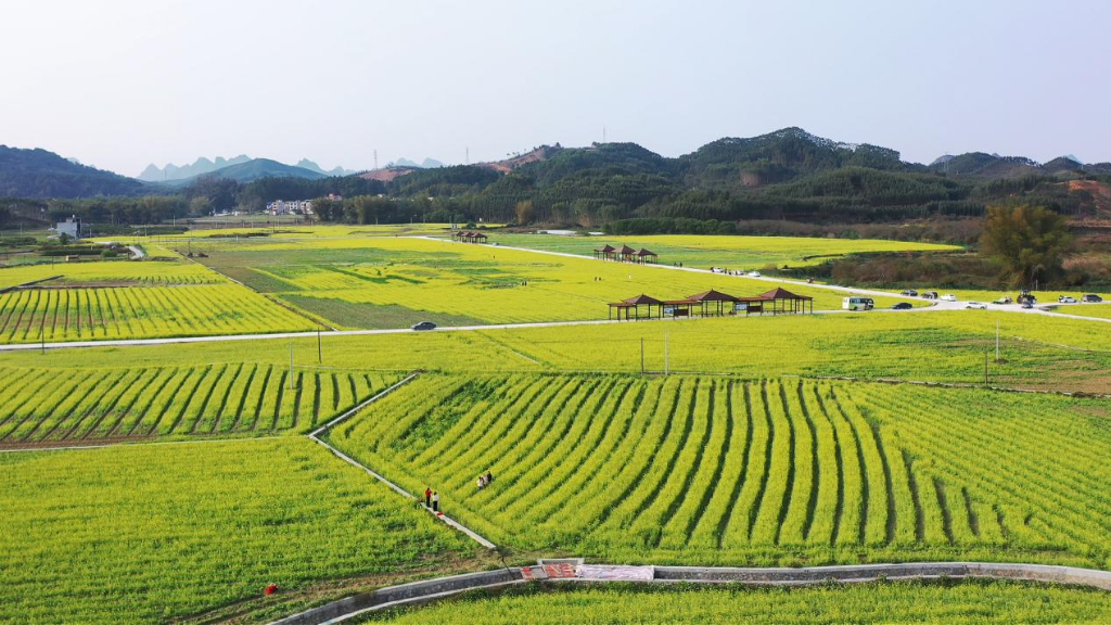 在南宁市马山县周鹿镇坛利村下潘屯现代种业科技产业园内,400余亩油菜花迎来盛花期,金灿灿的花海铺展在田野间,与不远处的村落民居、层叠青山相映成趣,游客们三五成群在这里赏花拍照,乐享春光。