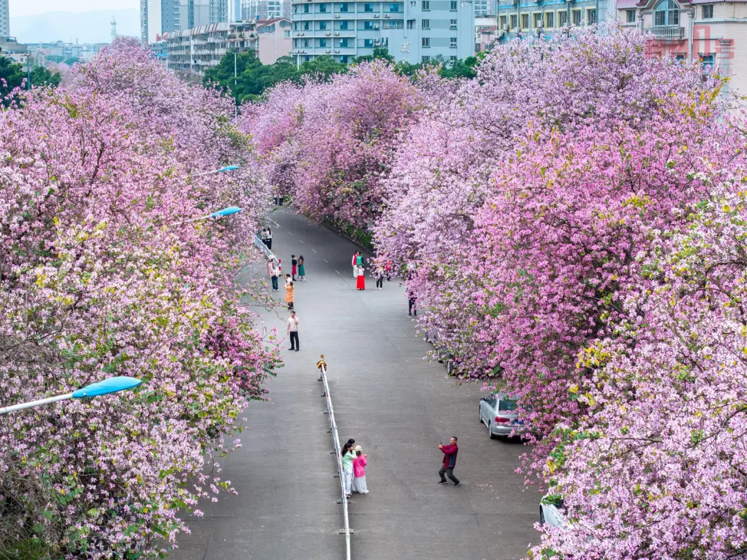 洋紫荆的盛开,不仅提升了柳州市的颜值和气质,更让人们对这座老工业城市刮目相看,成为一张亮丽的城市名片。近年来,柳州市以洋紫荆为牵引,持续激活“赏花经济”,为城市的发展增添新动能。
