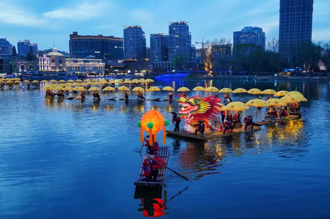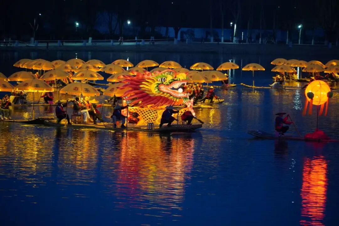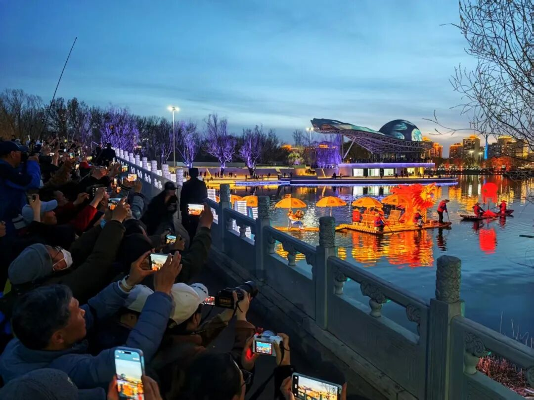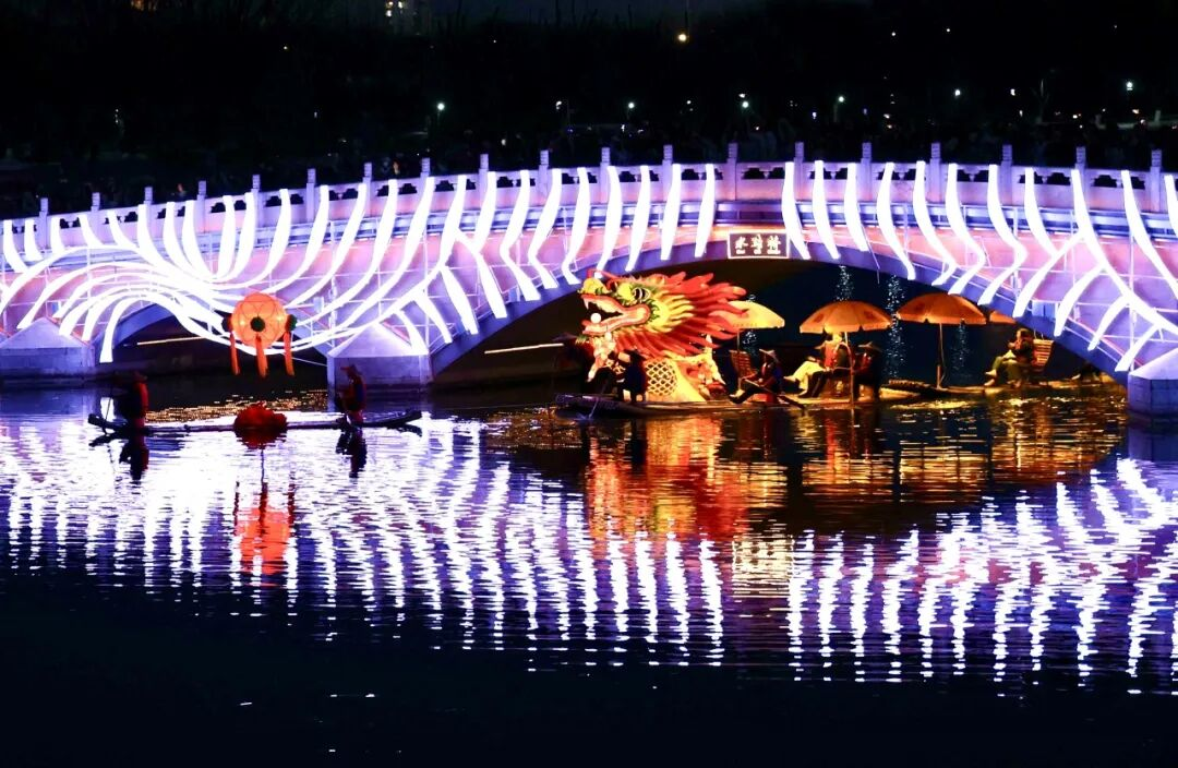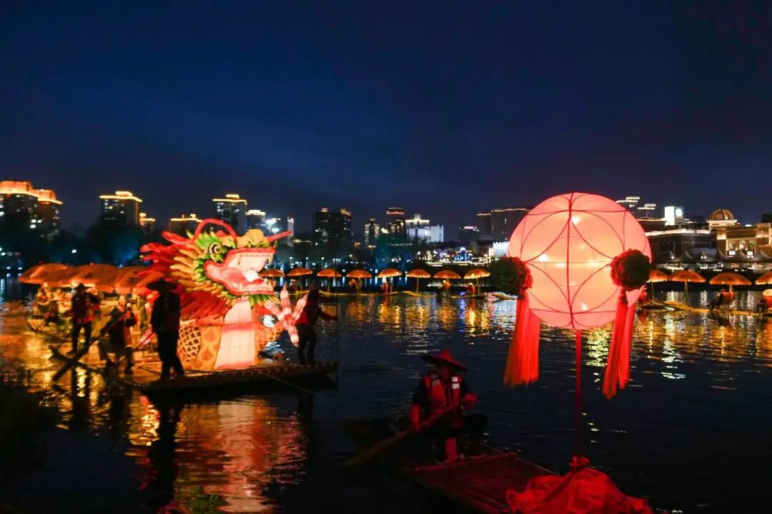 华灯初上时,北京金马河两岸霓虹闪烁,伴着《山歌好比春江水》悠扬的旋律,一条长240多米的“金龙”缓缓游到河中,“金龙”蜿蜒游动、气势磅礴,瞬间点燃四周围观市民、游客的热情。
