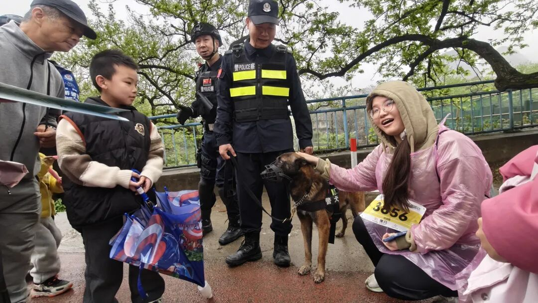 “桃花江畔春色满” 是贯穿整条路线的视觉主线。从鲁家村到庙门前村,沿江步道两侧,粉红的桃花、雪白的梨花、金黄的迎春花次第开放,在春雨洗涤下色彩尤为鲜亮。路边站岗执勤的帅气警犬也成为小朋友们争相合影的小明星。